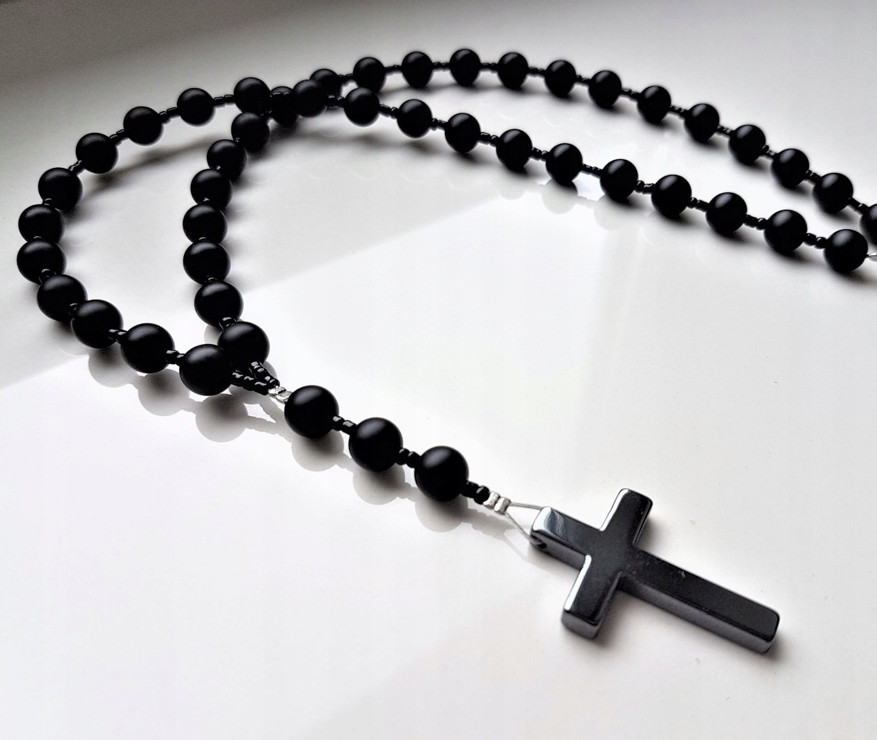 Шарик из МАТОВОГО оникса с диаметр 8мм, гематитовый крестик 3,2/2,2 см, бусины Jablonex, стальной ювелирный шнур.