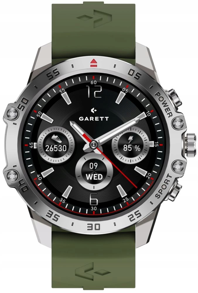 Авторизованный салон фирменных часов представляет собой Garett v14 на серебристом, стальном браслете и дополнительной силиконовой батончике в зеленом.