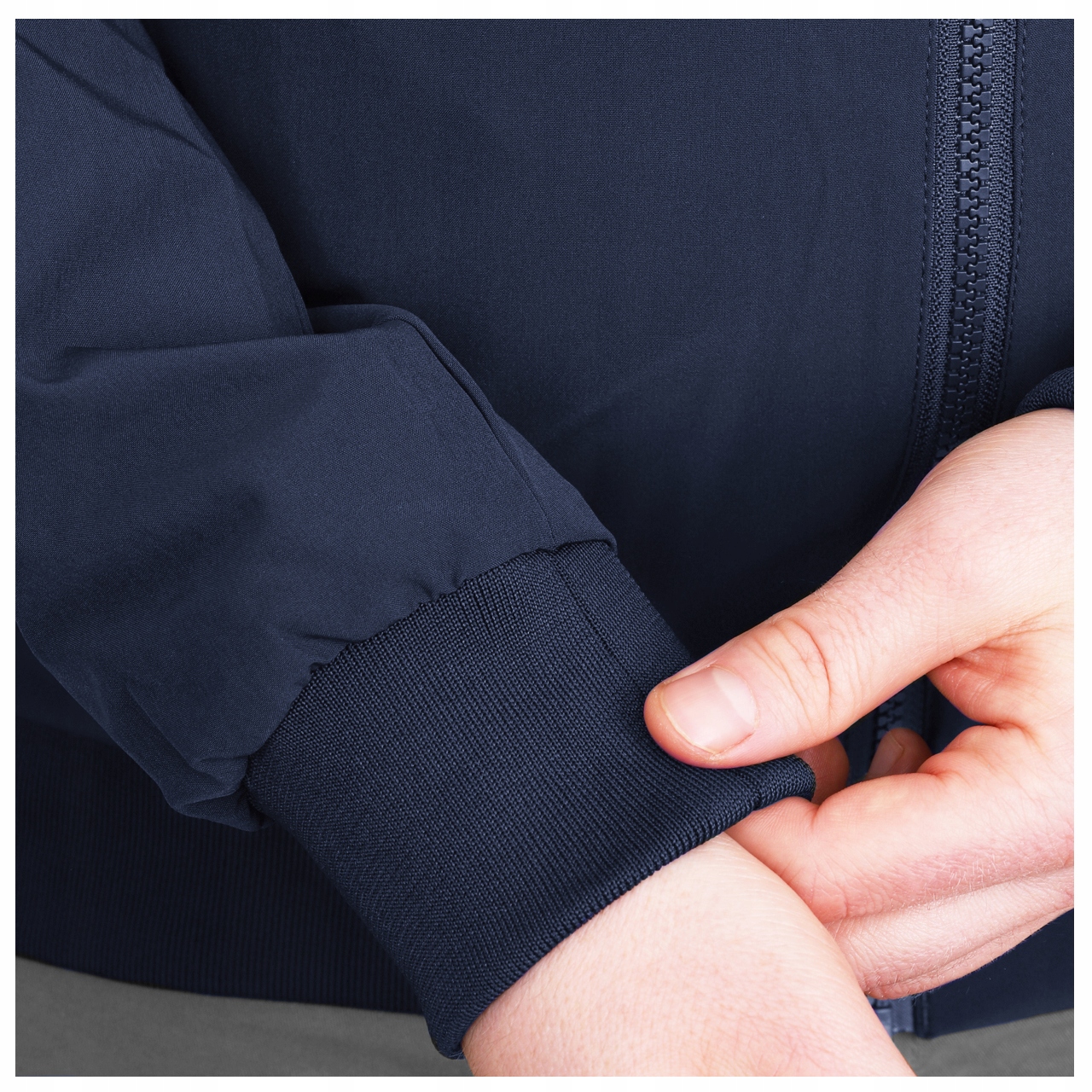 Куртка имеет низкий воротник/стойку из ранта, как у бейсбольных курток.