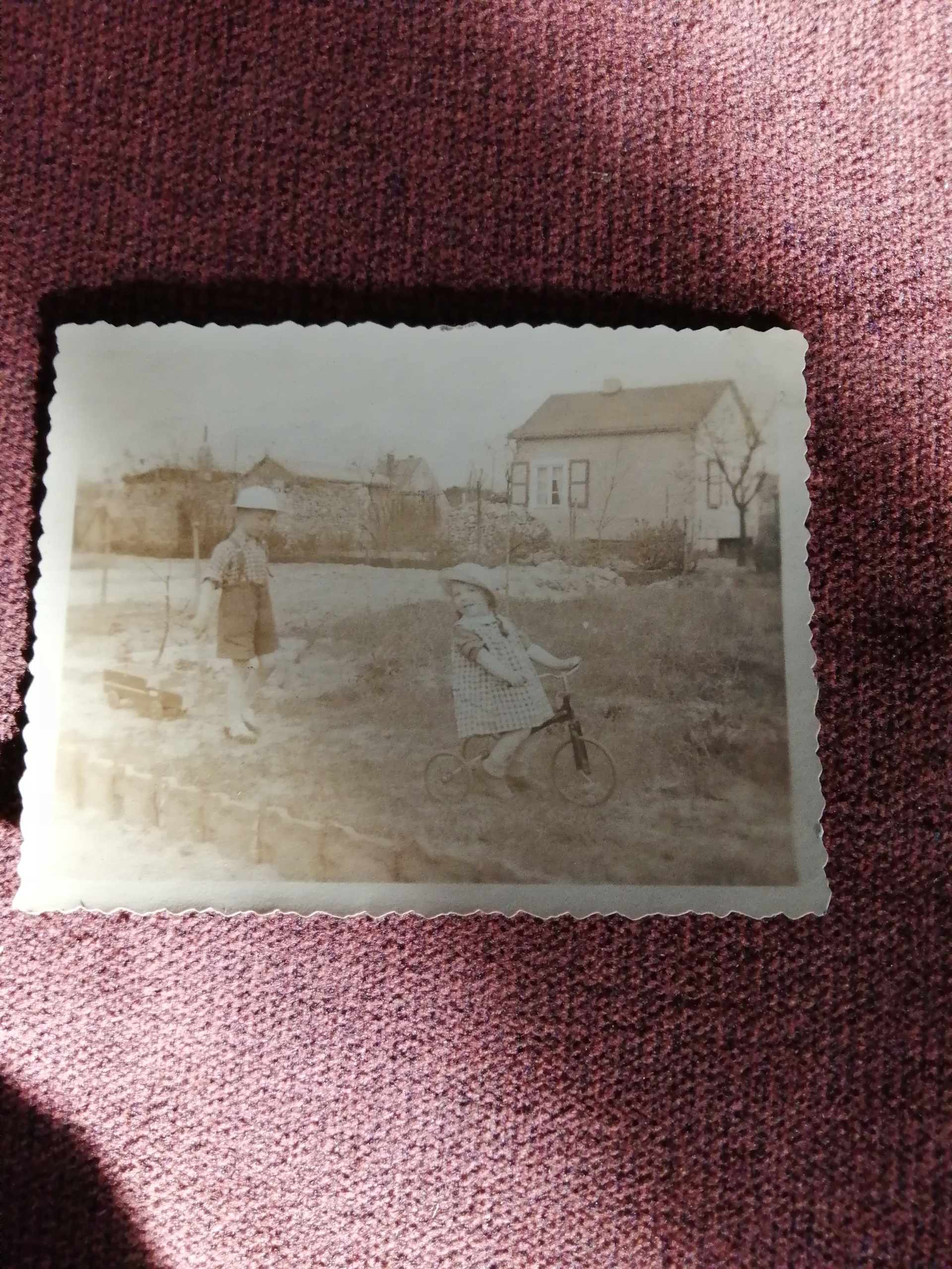 CHŁOPIEC ZABAWKĄ SAMOCHÓD DZIEWCZYNKA NA STARYM ROWERKU