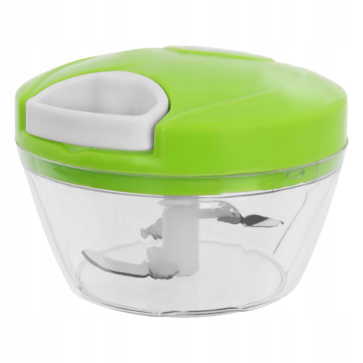 Измельчитель овощей и фруктов состоит из контейнера с крышкой, который оснащен удобной ручкой на веревке, служащей для измельчения продуктов. Внутри контейнера имеется небольшой выступ для крепления лопастей, стабилизирующий работу лопастей.