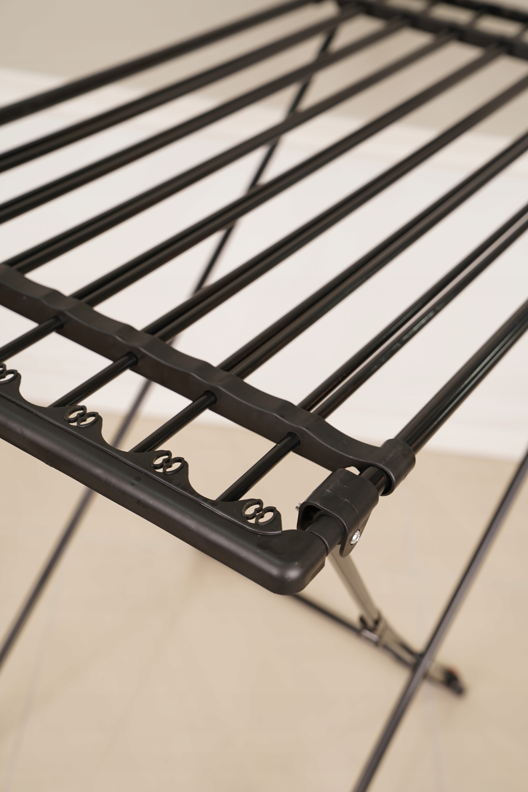 Черная телескопическая сушилка - это твердое и практическое решение, которое позволяет комфортно сушить мытья как дома, так и на открытом воздухе. Изготовленный из порошкового металла и армированных пластиковых элементов, он устойчив к коррозии и деформации. Дополнительные чехлы на ногах защищают землю от царапин, и благодаря двум колесам вы можете легко переместить ее, даже когда она полна влажной одежды.