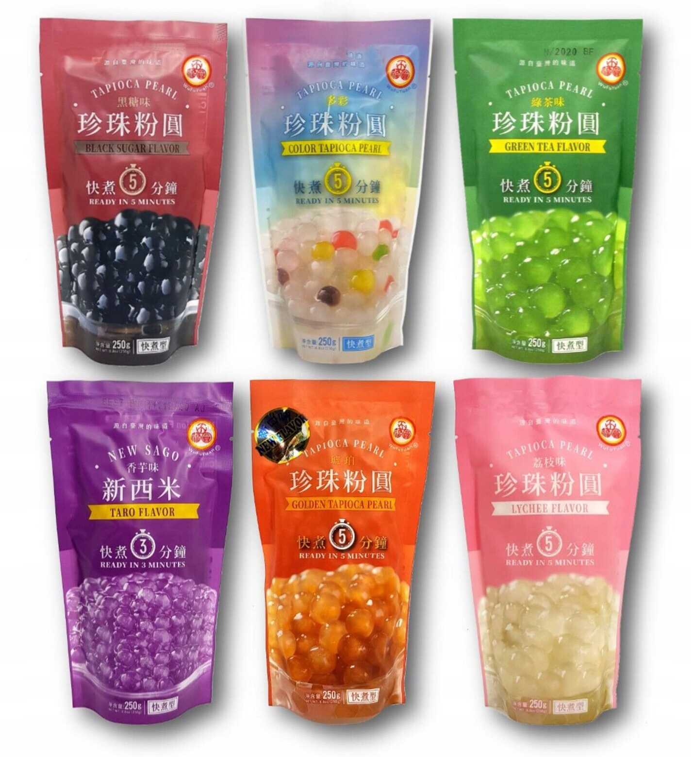 Instant Pearl Black Sugar — шарики тапиоки домашнего приготовления производства тайской компании Wu Fu Yuan со вкусом черного сахара с добавлением карамели. Жемчуг тапиоки обычно используется в качестве дополнения к десертам, молочным напиткам и пузырьковому чаю. После замачивания в воде жемчуг набухает, меняя форму на мягкие шарики с разными вкусами. После замачивания отварите их в кастрюле или в микроволновой печи, и через 2 минуты они готовы!