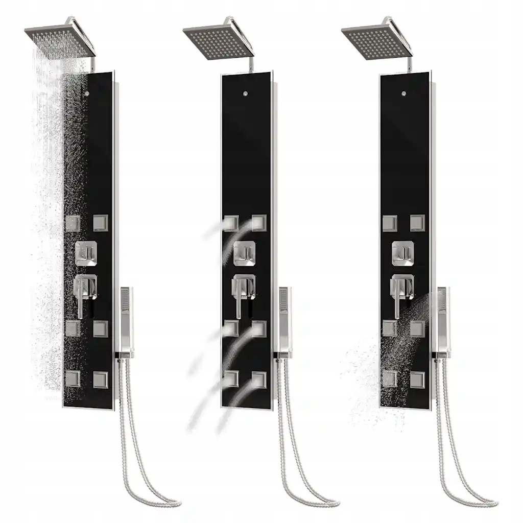 Панель для душа изготовлена из из нержавеющей стали и закаленного стекла . Закаленное стекло создается в процессе тепловой или химической обработки, увеличивая его долговечность и безопасность по сравнению с обычным стеклом. Продукт предлагает 3 формы душа : дождь, водяной ручьи и сопели с ручными телефонами. Силиконовые форсунки устойчивы к каменному осаждению.