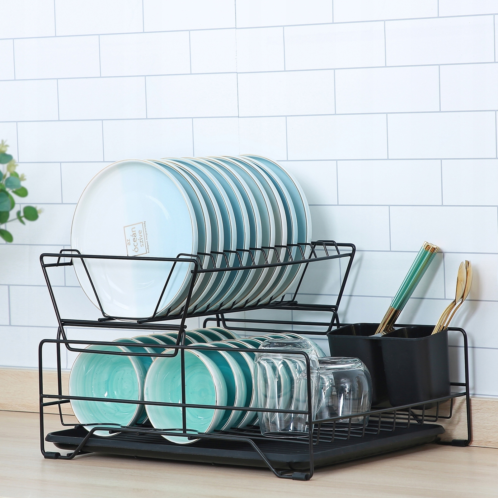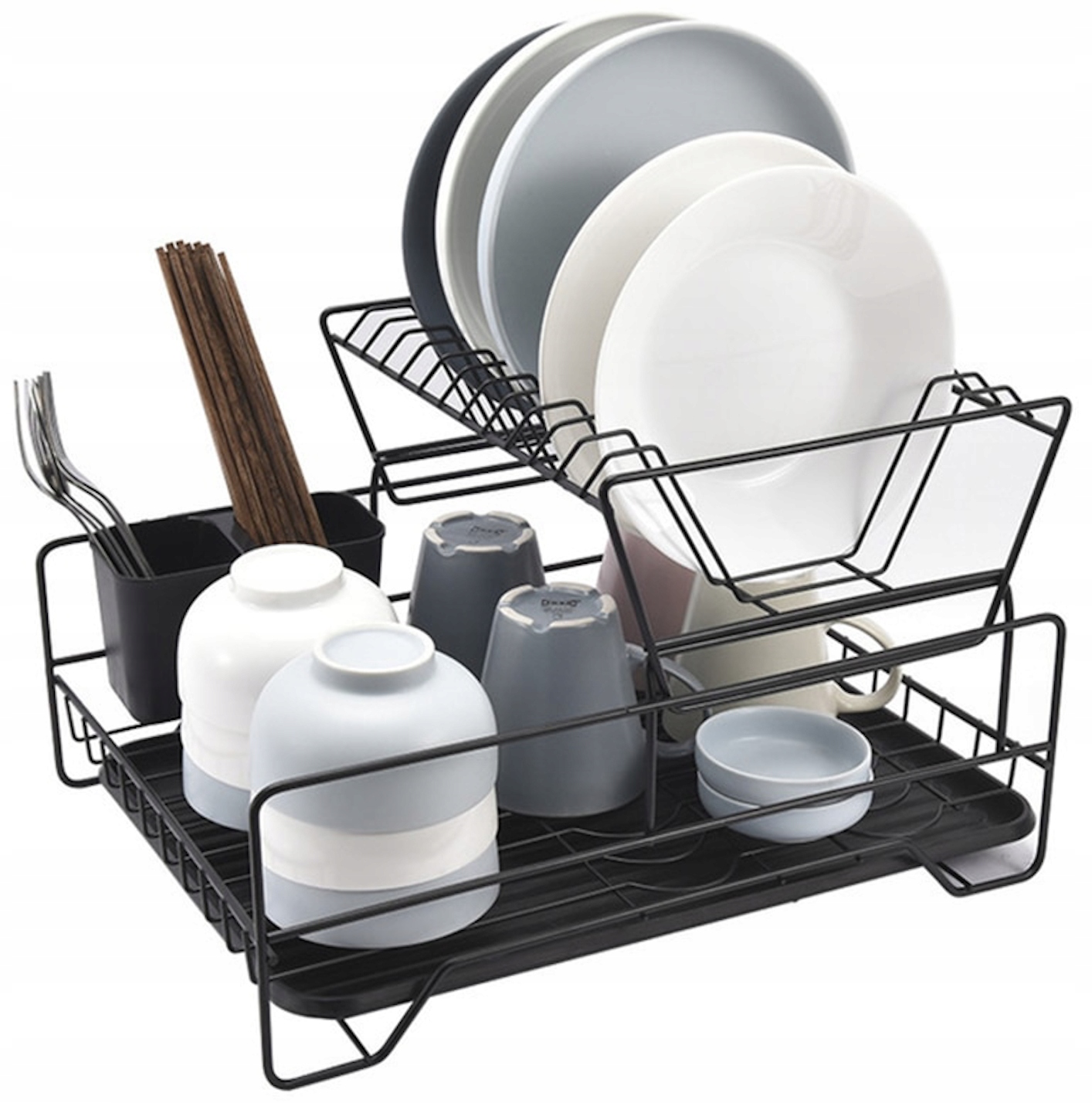 Сушилка очень вместительная благодаря своей двухуровневой конструкции: на верхней полке можно разместить 11 тарелок, а на нижней полке — тарелки, миски, чашки и стаканы меньшего размера.