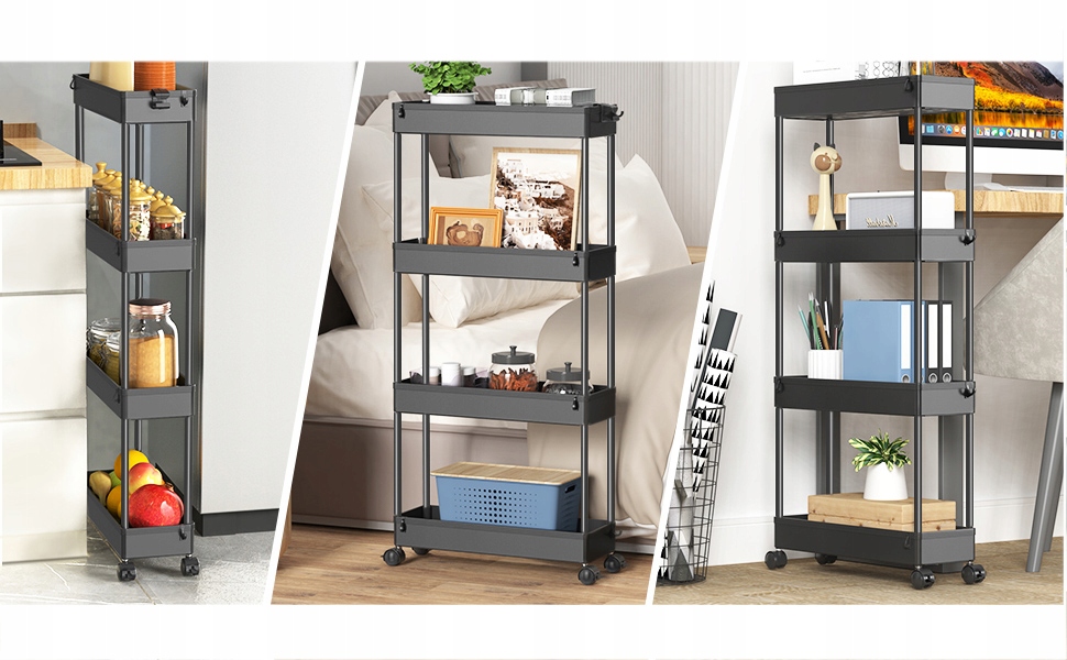 ЧЕРНАЯ МОБИЛЬНАЯ ПОЛКА НА КОЛЕСАХ КУХОННАЯ ТЕЛЕЖКА С 4 ПОЛКАМИ ДЛЯ УЗКОЙ КУХНИ