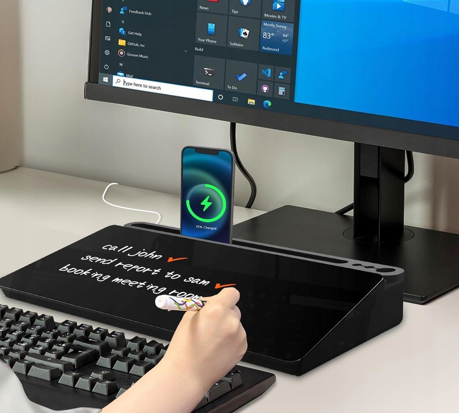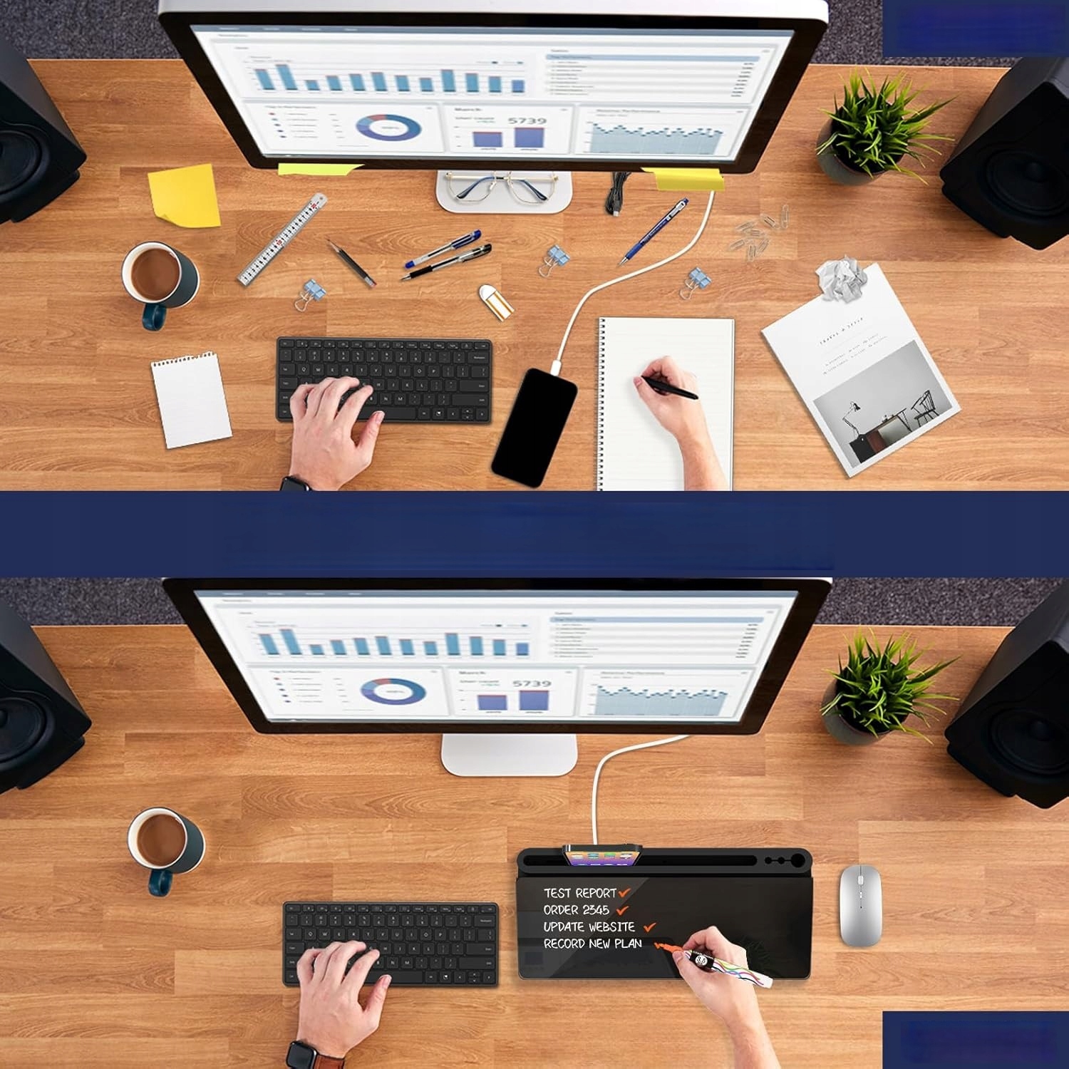 - 【Многофункциональность】На доске также есть слот для устройства с вырезом для порта зарядки и 3 держателя для ручек сверху. Противоскользящая накладка внизу предотвращает скольжение. Кроме того, доска спроектирована под идеальным углом для письма, обеспечивая комфорт для глаз и запястий. Это больше, чем просто обычная белая настольная доска с местом для хранения — ее можно использовать как подставку для клавиатуры, настольный органайзер, держатель/подставку для телефона.