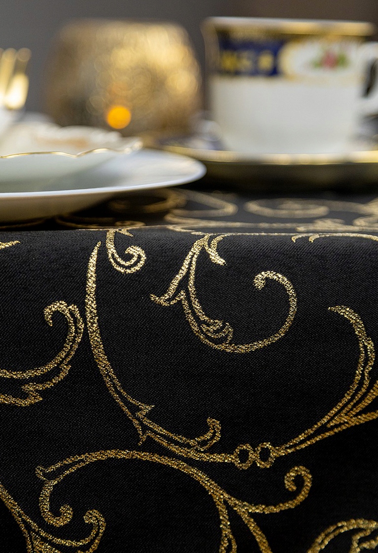 Роскошный (премиум -класс), элегантный черный шаг с блестящими, золотыми речами. Металлизованный узор подчеркивает уникальный характер стола, он чрезвычайно декоративный и в то же время очень стильный. Он не разваливается, нить вплетается в ткань.