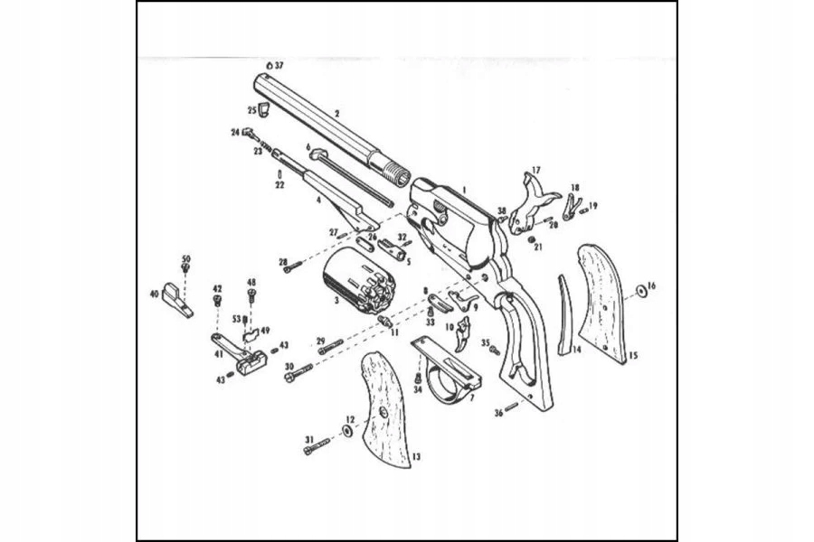 загружен подробной латунной рамой и 8 -Inch Barrel . Длинные бочки использовались американской кавалерией. Оружие с никелем легче чиститься после стрельбы