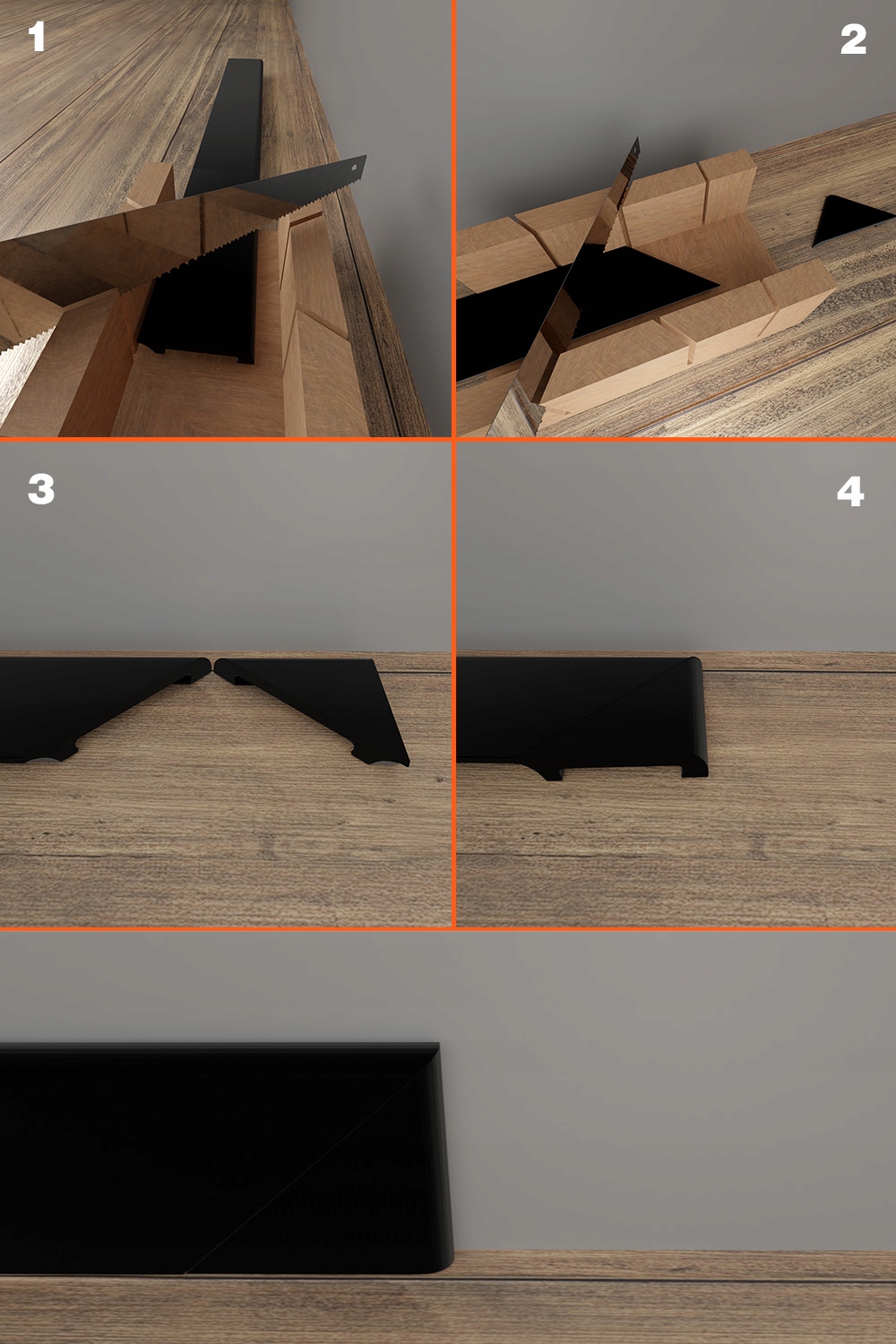Поместите плинтусную лодку на основе порезов. Установите полосу в положение, показанное на шаге 1, чтобы край идеально установил под углом 45 градусов. После разрезания планка мы получим кусок, который служит нам в качестве финала.