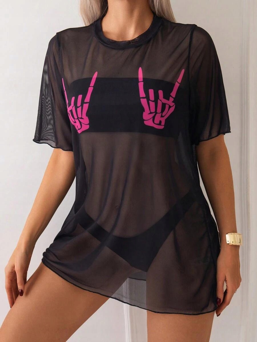 SHEIN ЧЕРНАЯ ПЛЯЖНАЯ ТУНИКА С СЕТЧАТЫМ ПРИНТОМ UE4 NJ4__XL