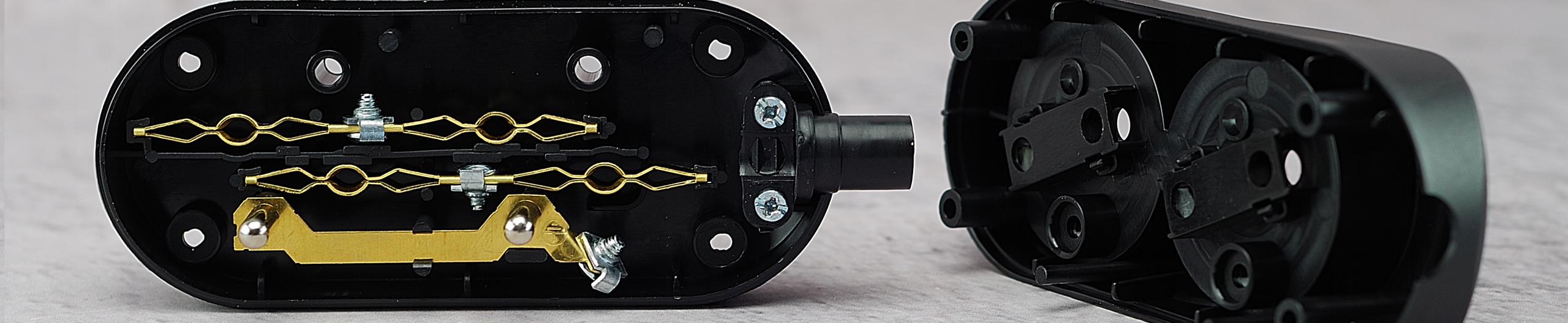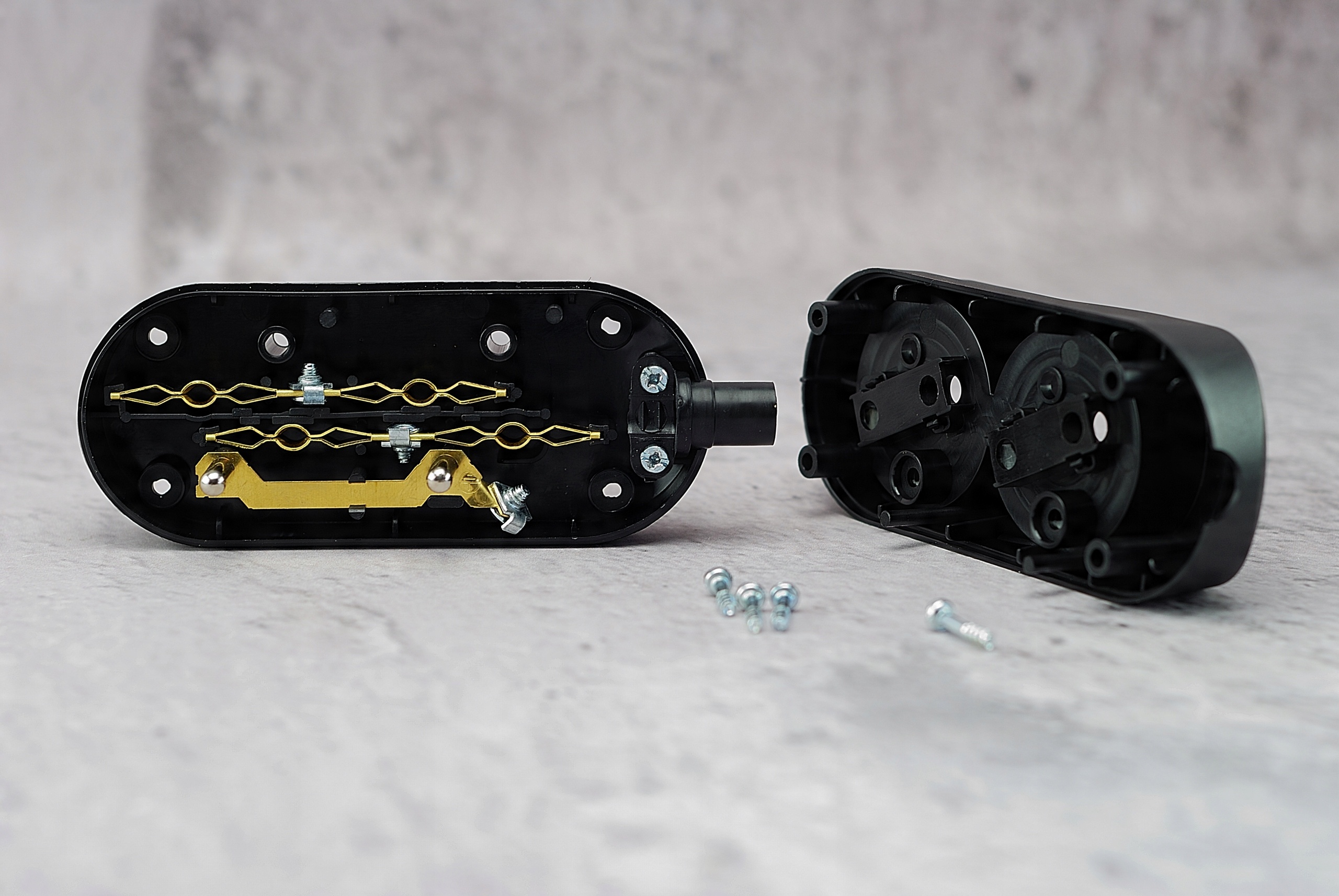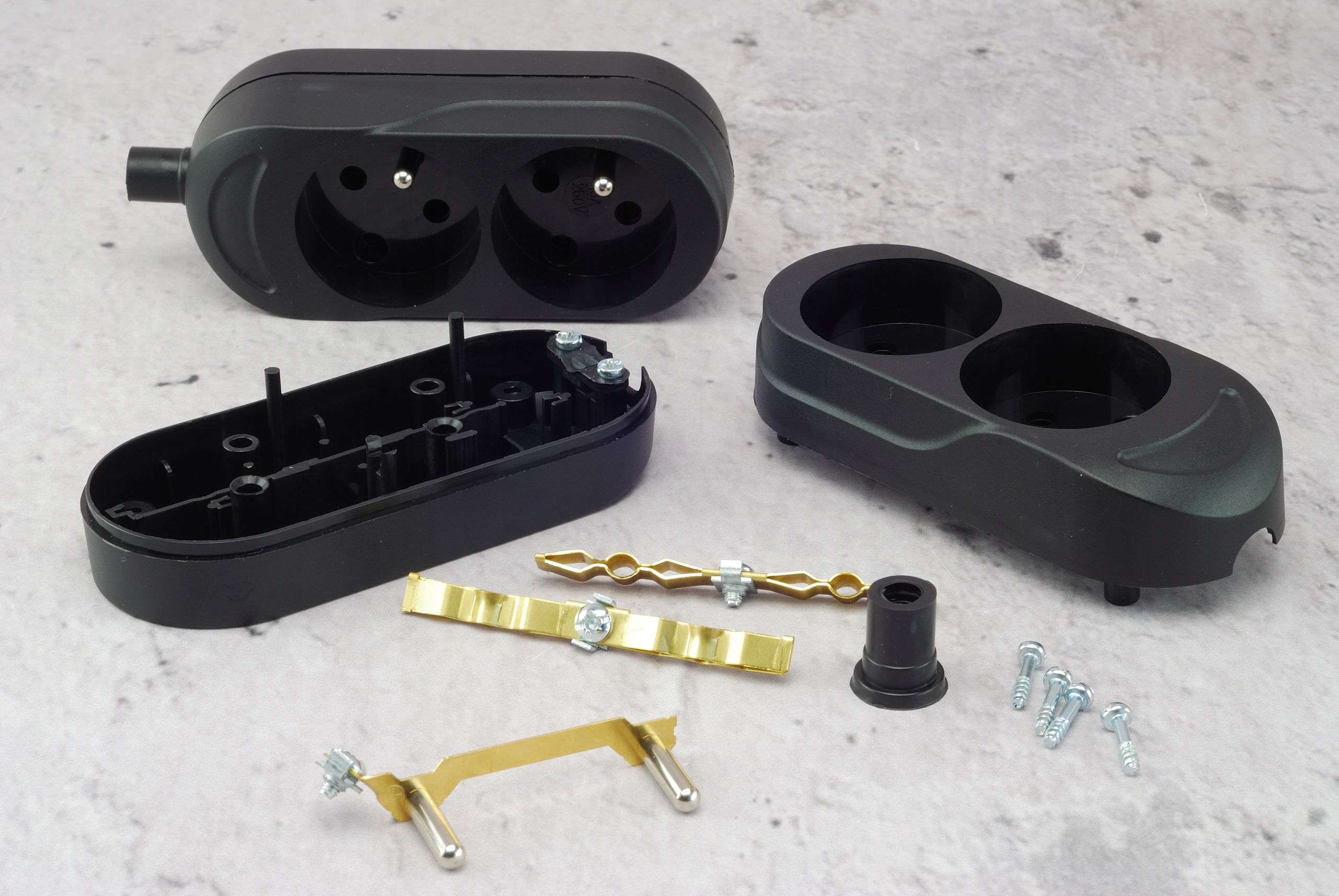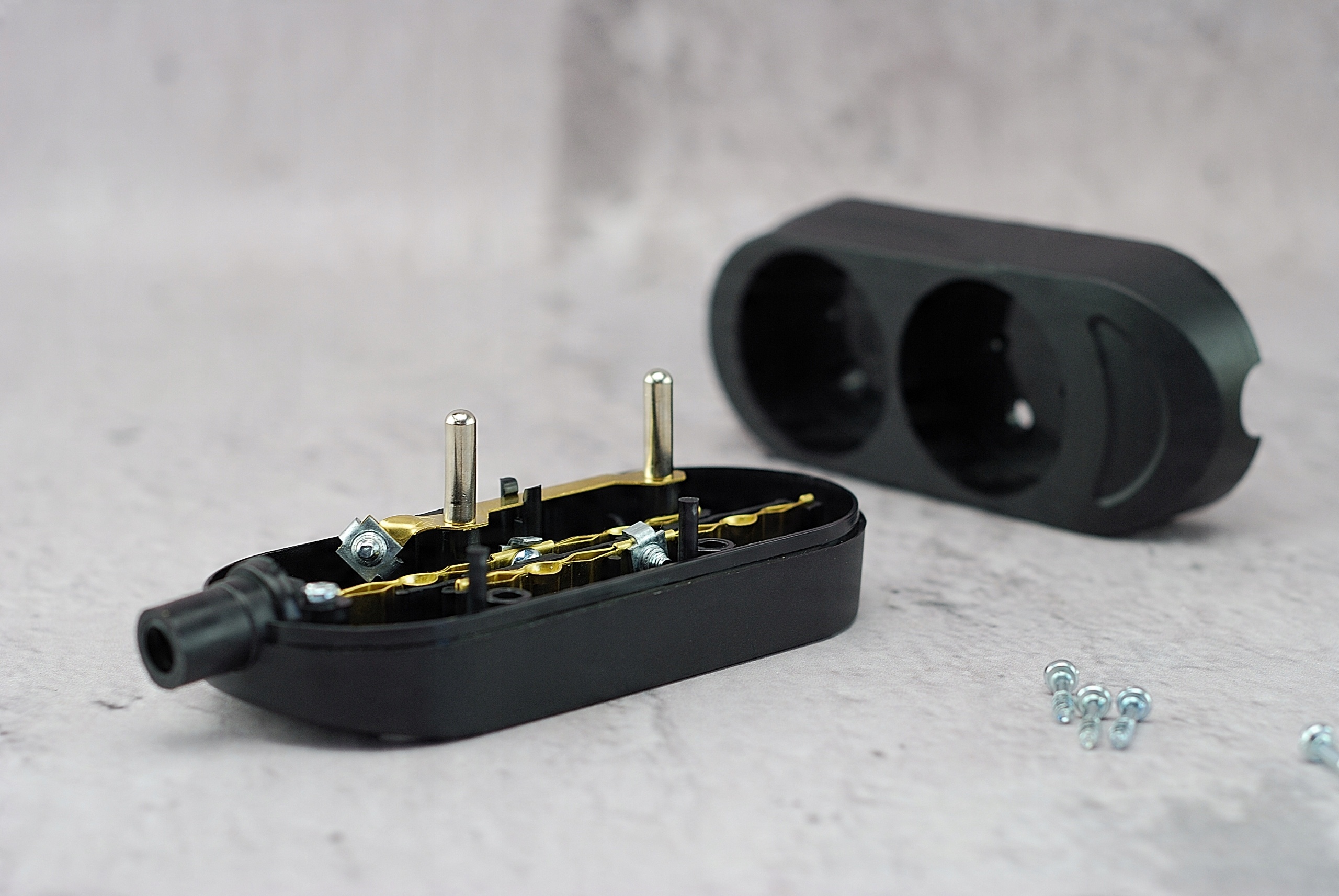 Корпус розетки состоит из двух элементов, скрепленных между собой винтами. Внутри все элементы для прикручивания кабелей съёмные, что значительно упрощает монтаж.