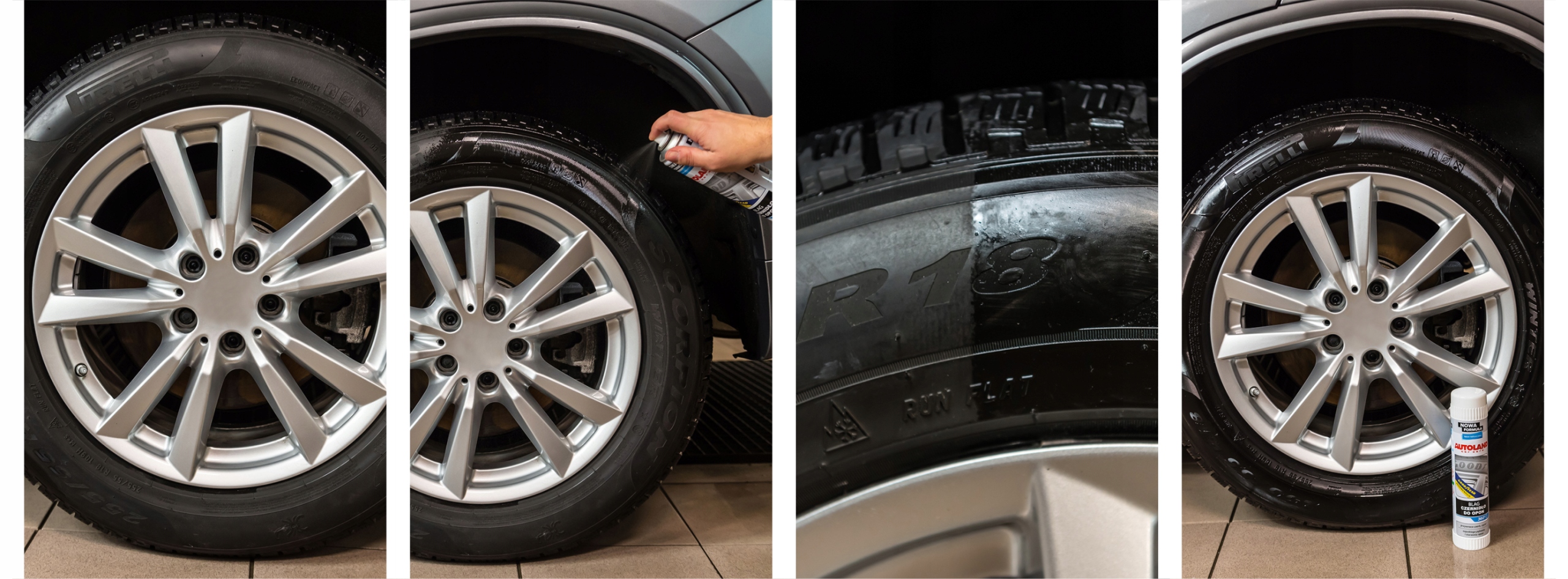 Восстанавливает первоначальный цвет шин и подчеркивает их глубокий, «мокрый» черный цвет. Сохраняет и защищает резину от вредного воздействия погодных условий (соли, дорожной грязи). Улучшает эластичность резины – предотвращает старение и растрескивание кромок шин. Содержит УФ-фильтр - предотвращает выцветание.