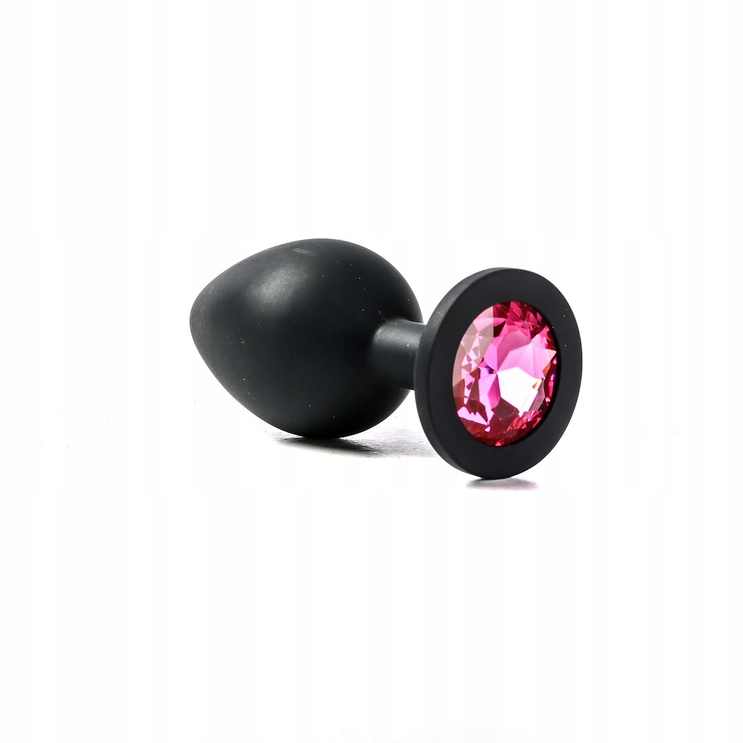 Силиконовая черная анальная пробка, размер M, темно-розовый кристалл