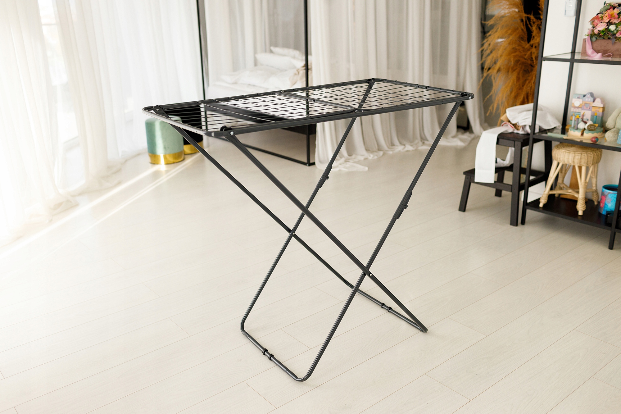 Используется система складных крыльев, скрещенных ножек и сломанной ножки. Это делает сушилку чрезвычайно практичной, поскольку ее легко раскладывать и складывать.