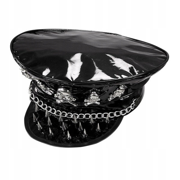 У нее жесткий козырек и серебряные украшения, такие как цепочка, шипы и черепа.
