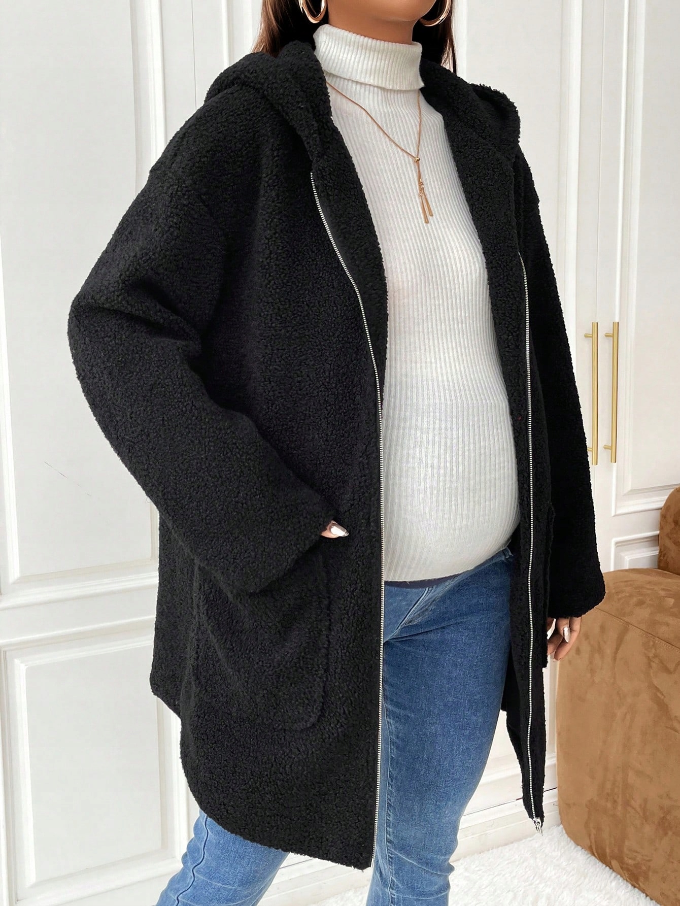 Черное пальто женского беременности Shein с капюшоном S с капюшоном