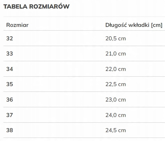 - Размер 32 –Длина стельки [см]: 20,5 см.