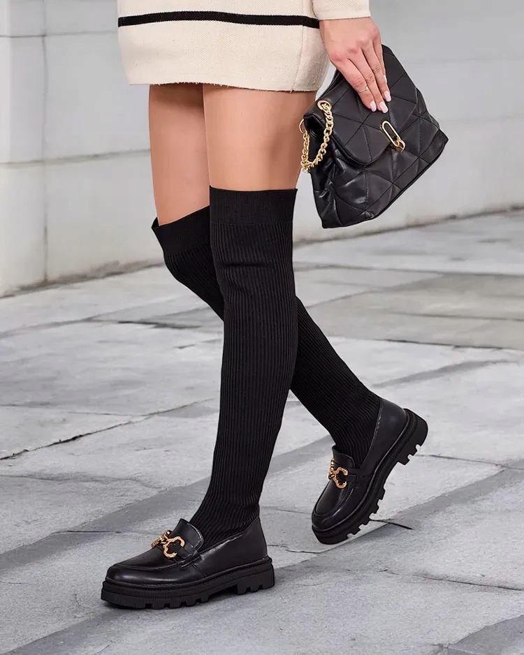 Стильные женские ботфорты на плоском каблуке. Верх выполнен из гибкого тканевого материала и вставок из эко-кожи, внутри тканевая вставка. Модель слипона. Идеально подходит для повседневных осенних образов!