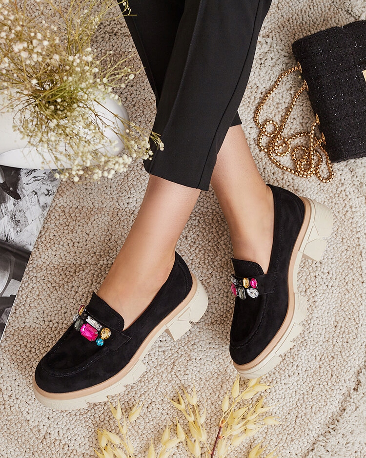 Красивые женские мокасины на массивной подошве. Повседневная модель выполнена из экологической замши, стелька – из натуральной кожи. На носу украшение из разноцветных камней. Идеальная база для многих повседневных образов!