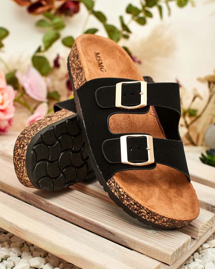 Отличные женские шлепанцы на плоской подошве. Изготовлен полностью из экологической кожи. Сверху имеются декоративные пряжки. Подошва декорирована пробковым материалом. Идеальный выбор для отдыха!