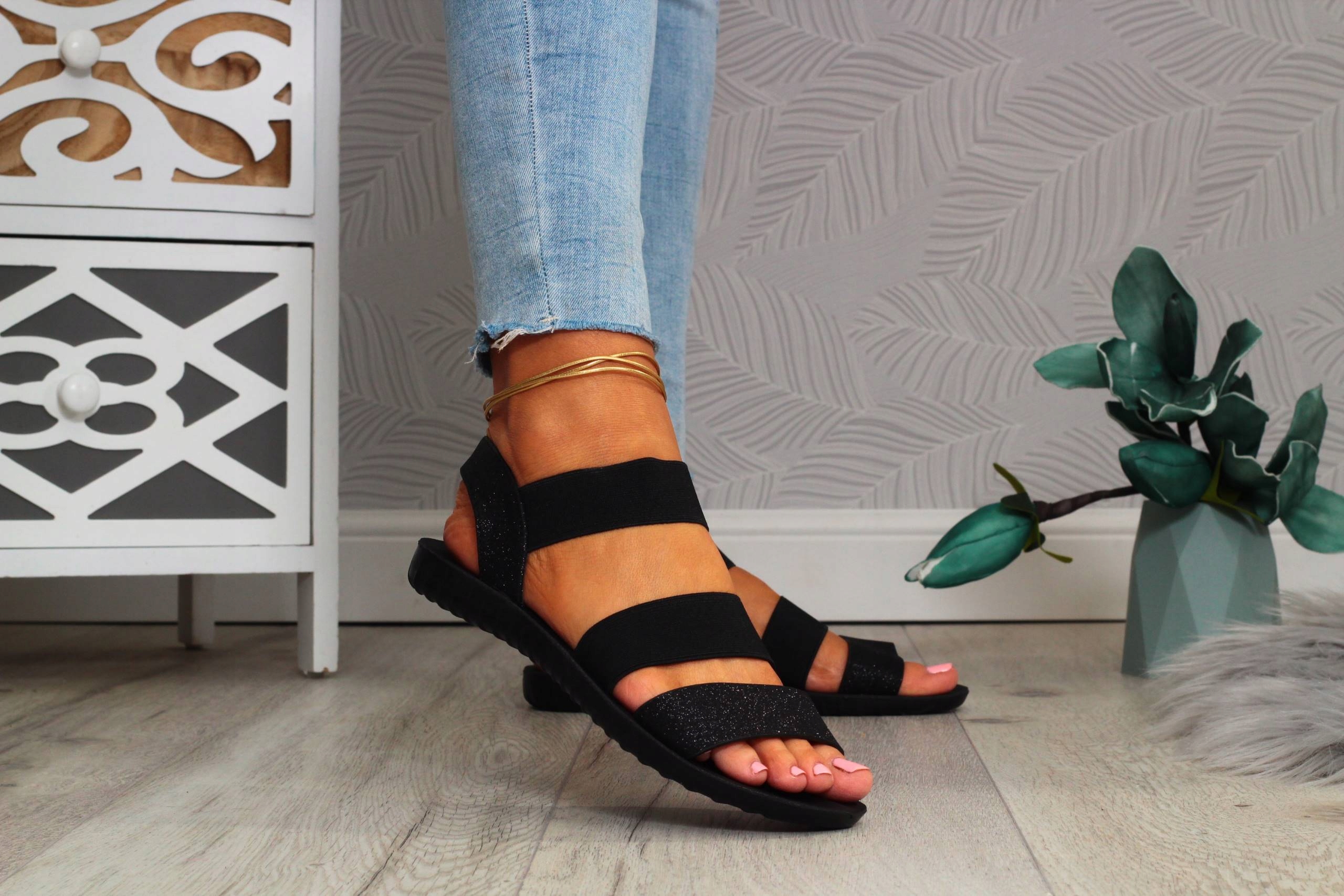 Женские босоножки черного цвета с плоским низом. Они подойдут как в качестве повседневной обуви в жаркие летние дни, так и в качестве обуви для особых случаев. Простой дизайн подойдет ко многим стилям, а блестящая отделка добавит очарования каждому из них. Резиновый ремешок на щиколотке облегчает надевание туфель и регулировку по ноге.