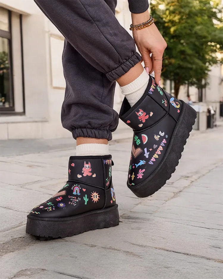 Отличные женские зимние снежные ботинки на платформе. Верхняя часть изготовлена из экологической кожи, мех изолирован. Целое украшено разноцветными наклейками. Идеальная база для зимы!