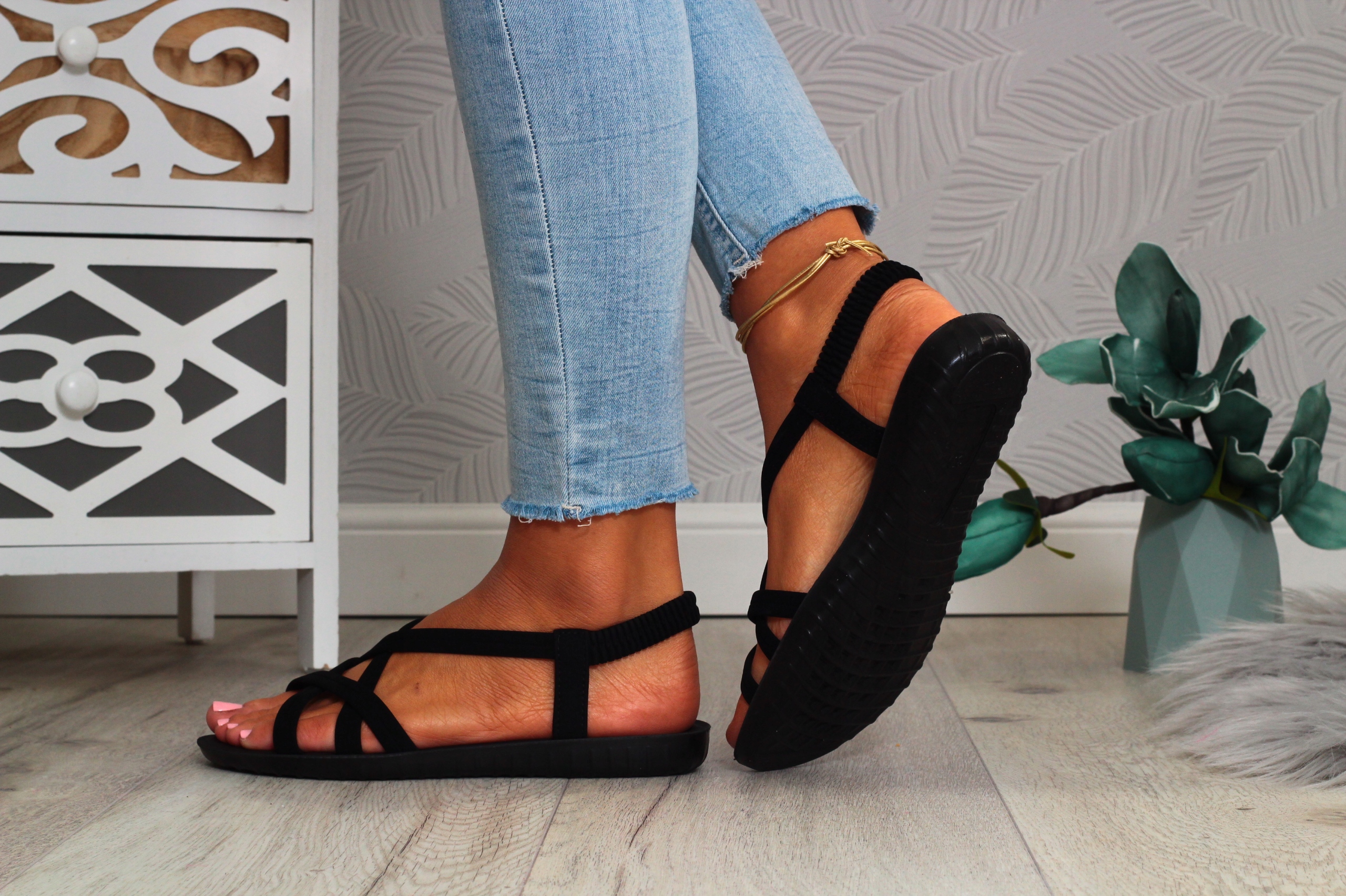 Женские босоножки черного цвета с плоским низом. Они подойдут как в качестве повседневной обуви в жаркие летние дни, так и в качестве обуви для особых случаев. Простой дизайн подойдет ко многим стилям. Эластичный ремешок на пятке облегчает надевание туфель и регулировку по ноге.