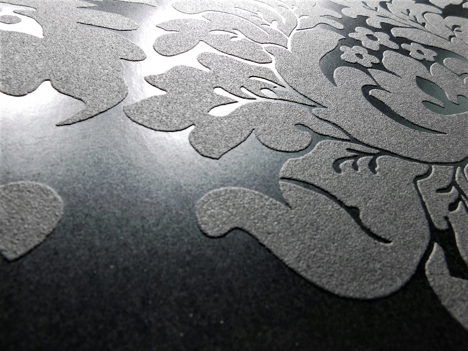 Четкая фактура обоев, выпуклый орнамент с бархатной структурой, сатиновый глянцевый фон.