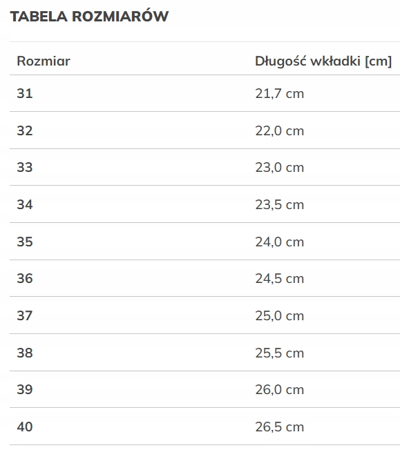 - Размер 40 –Длина стельки [см]: 26,5 см.