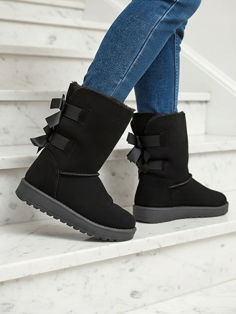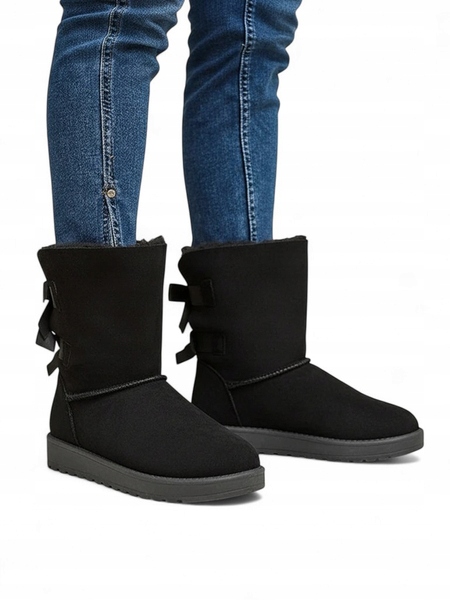 Вневременные женские зимние ботинки без шнуровки из экологической замши. Спинка модели украшена бантиками, внутренняя часть подбита мягким мехом. Они прекрасно подчеркнут любую вашу укладку!