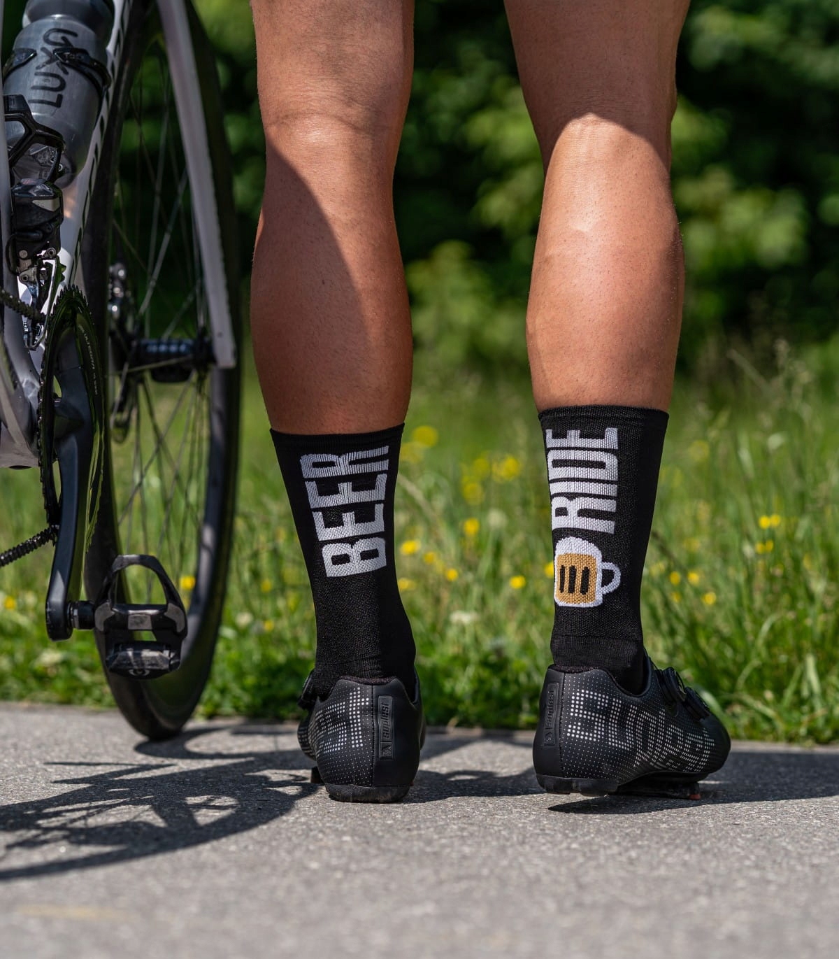 Черные носки с надписью "beer ride" на одной стороне. Универсальный мужской и женский фасон доступен в 4 размерах и двух цветовых вариантах.