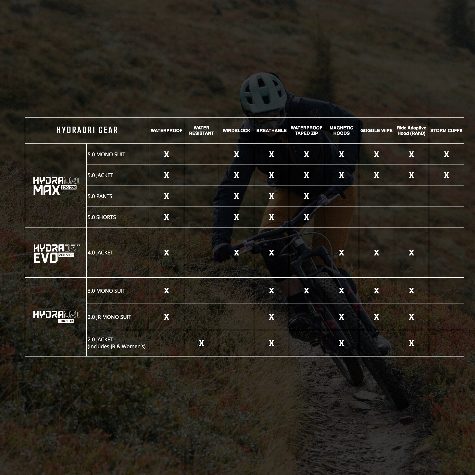 - HydraDri MAX 30 000 мм водонепроницаемая / 30 000 г/м² воздухопроницаемости.