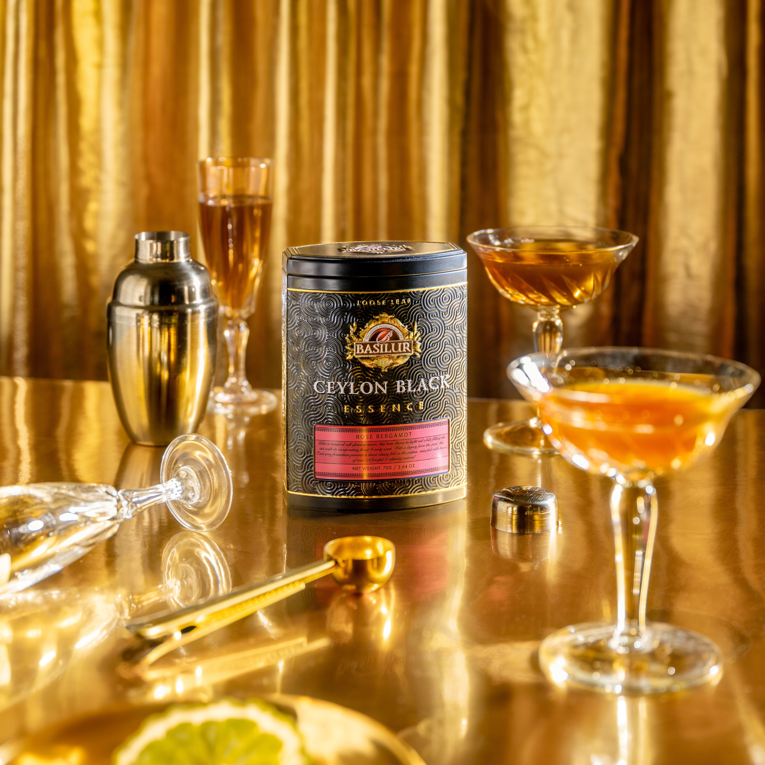 Чаи из коллекции Black Essence – идеальный подарок для любителей классики с ароматной ноткой! Листья черного чая были заключены в декорированную металлическую банку. Цвета черный, золотой и розовый придают всему этому элегантный и элегантный вид.