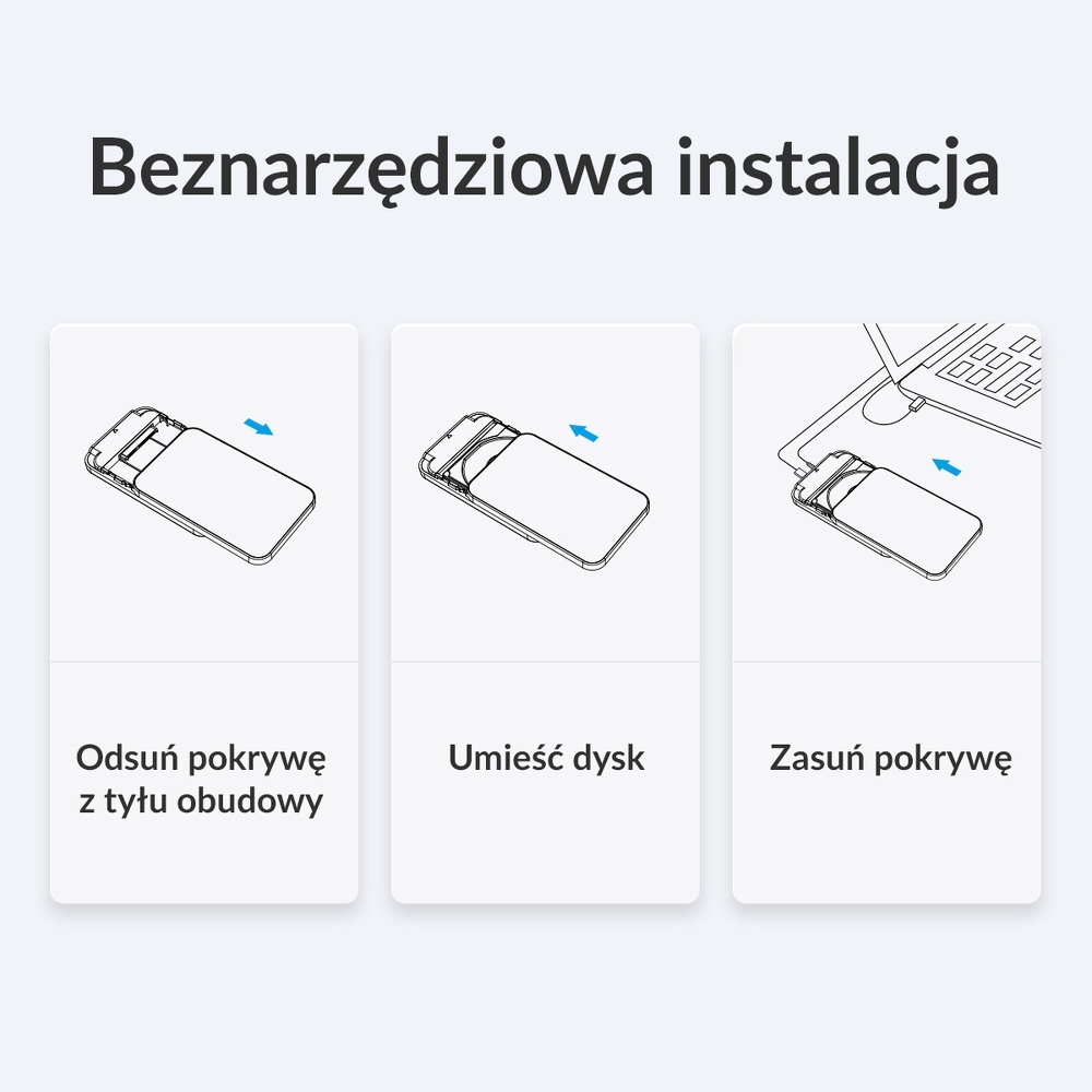 Карман поддерживает 2,5-дюймовые жесткие диски диаметром от 7 до 9,5 мм, совместимые с интерфейсом SATA 3.0, а также более старые версии 2.0 и твердотельные накопители SATA 3.0. Установка привода проста и не требует использования инструментов. Просто снимите крышку с задней части корпуса, вставьте диск штифтами в слот и наденьте крышку обратно. Правильно установленный диск не двигается.