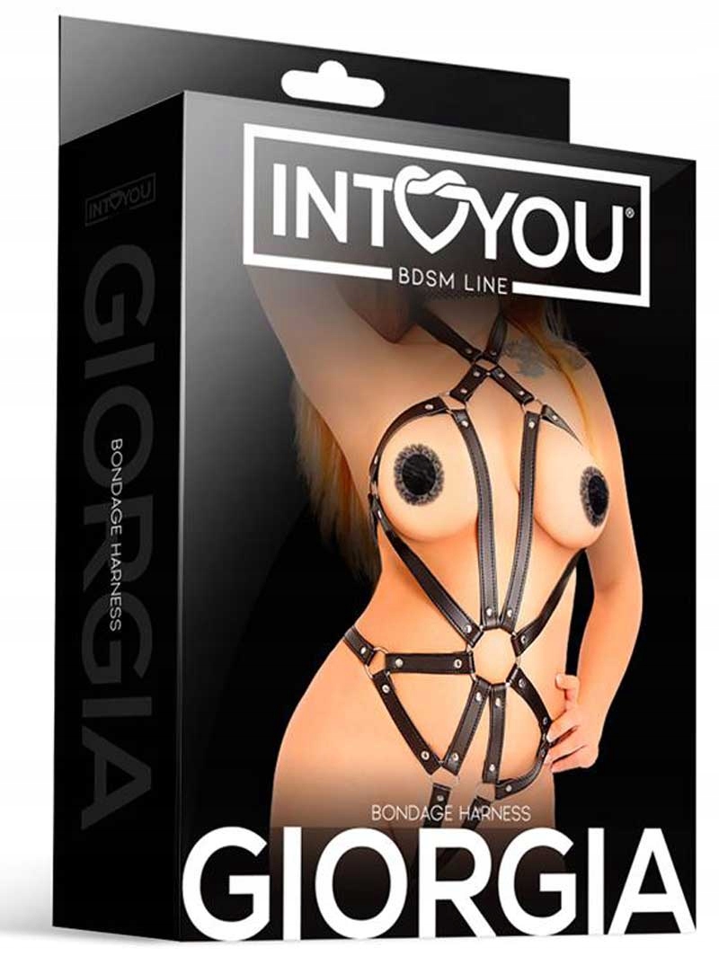 Впечатляющая шлейка, подчеркивающая достоинства женского тела. Ремень состоит из нескольких ремней в форме паука, которые соединены в центре талии большим О-образным кольцом. Все бретели соединяются в области бедер и шеи. У Giorgia есть ряд пряжек, позволяющих свободно регулировать привязь. Ремень из черной эко-кожи закрывает грудь и шею, создавая дополнительный акцент. Имеет форму открытого бюстгальтера с регулируемой застежкой, позволяющей подогнать его под форму фигуры.