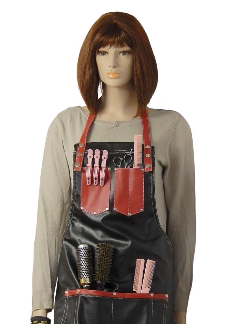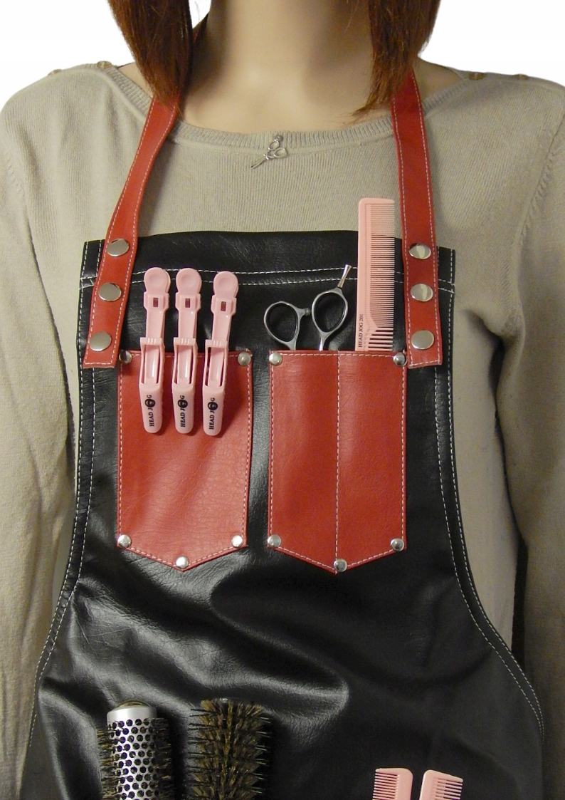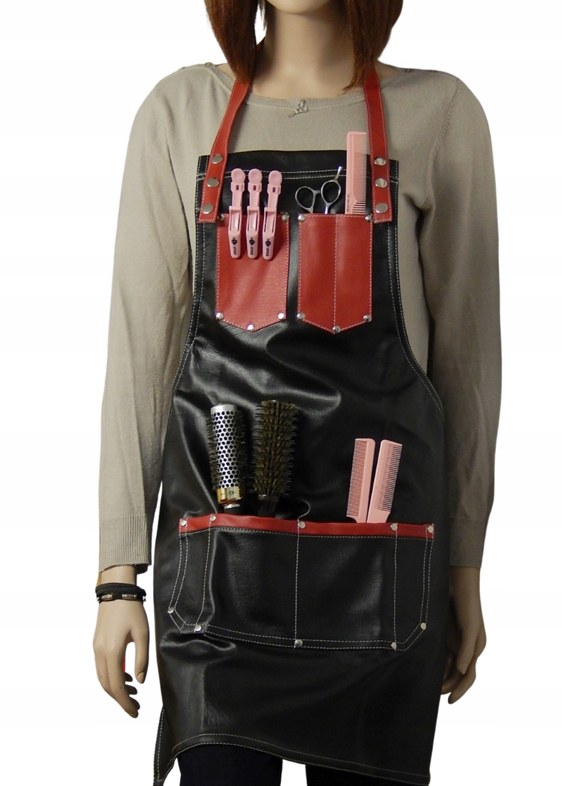 Элегантный парикмахерский фартук из прочной и привлекательной черной эко-кожи с красными вставками.