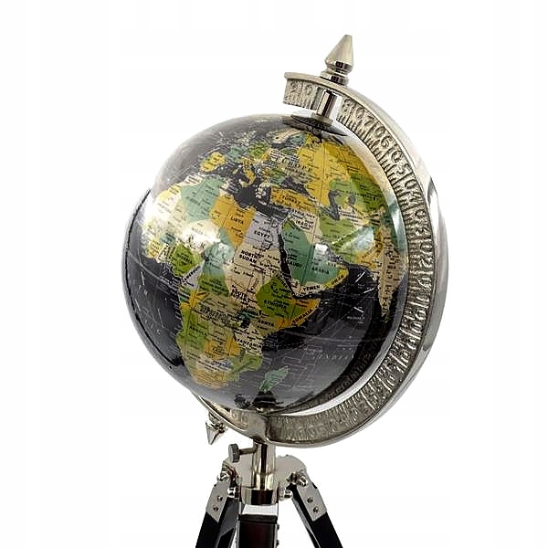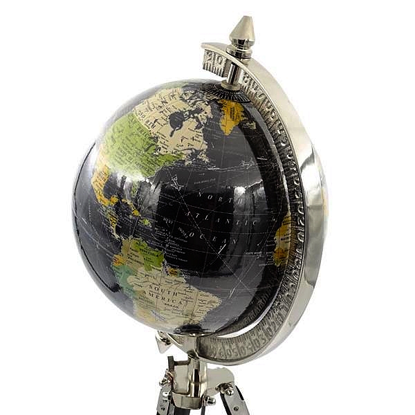 Красивый глобус, сфера с преобладанием черного цвета, в металлической рамке, географические названия на английском языке. Деревянная основа, черные океаны, земли в оттенках зеленого и желтого, красивое сочетание, географические названия на английском языке. Привлекательный декоративный элемент.