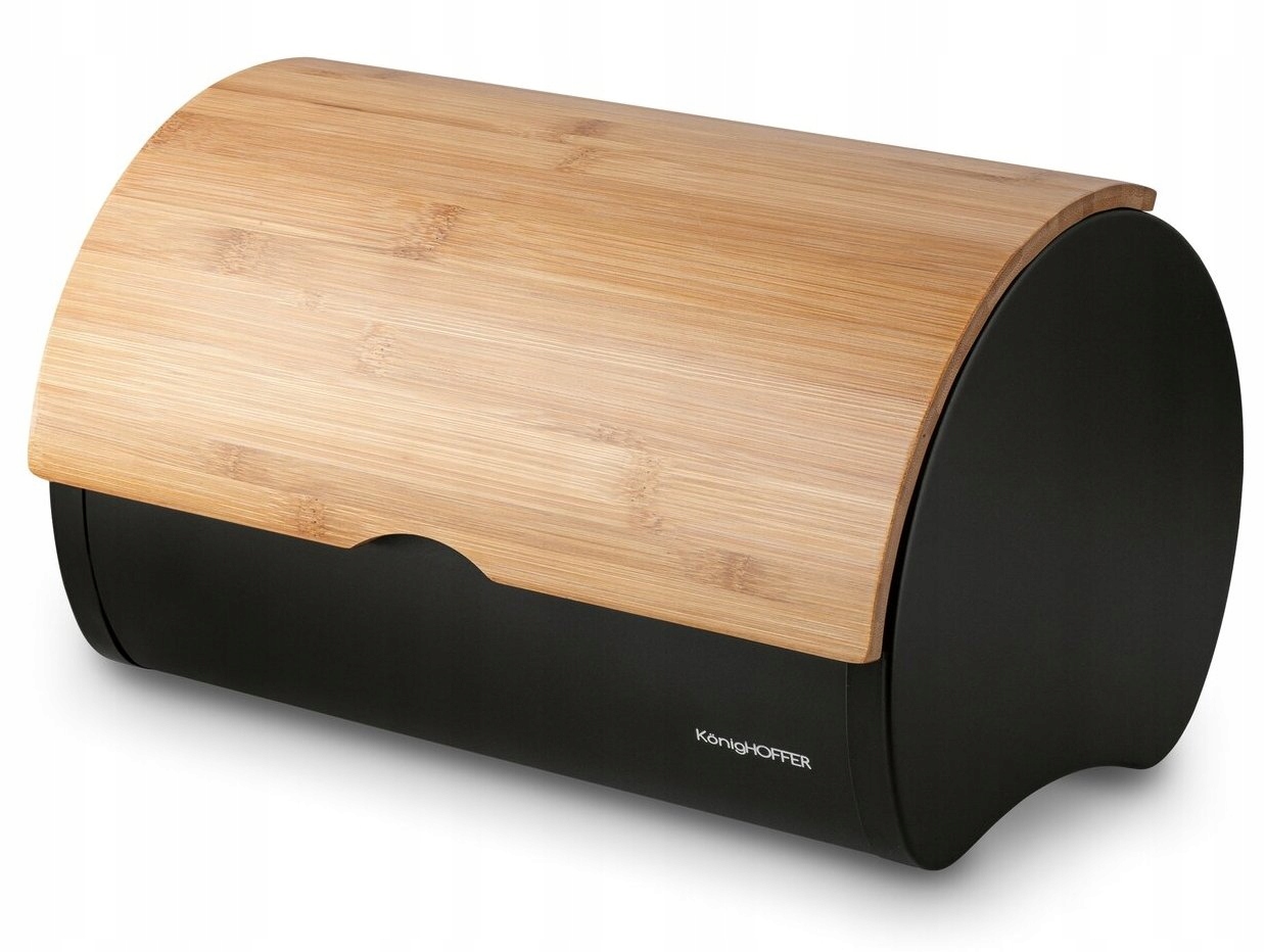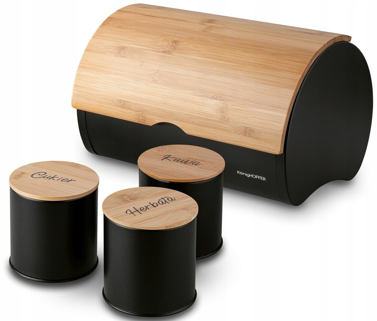 Черная металлическая хлебница Konighoffer Volano помогает продлить свежесть хлеба и позволяет каждое утро есть вкусный хлеб, без необходимости каждый день ходить в магазин. Благодаря своему уникальному дизайну он станет стильным элементом кухонного оборудования. Гладкие поверхности легко содержать в чистоте. Модель имеет застежку на петлях. Крышка хорошо защищает содержимое от грязи и света. Здесь можно разместить хлеб и булочки для всей семьи. Это предложение для тех, кто ценит свежесть, хрусткость и аромат свежего хлеба и ищет прочную и компактную хлебницу. Вы можете устойчиво разместить его на кухонной стойке, поскольку он имеет нескользящие резиновые ножки. Металл с порошковым покрытием (углеродистая сталь) и бамбук очень прочны. Также из них были созданы 3 контейнера для кофе, чая и сахара, добавленные в набор. Благодаря им вы также сможете защитить содержимое кухонных банок от случайного проливания. Набор рекомендует Ева Вахович. Как амбассадор бренда Konighoffer, она горячо и с улыбкой рекомендует его для домашнего использования. Вместе с ним вы получите свой рецепт для дома. Это один из лучших вариантов в этой категории!