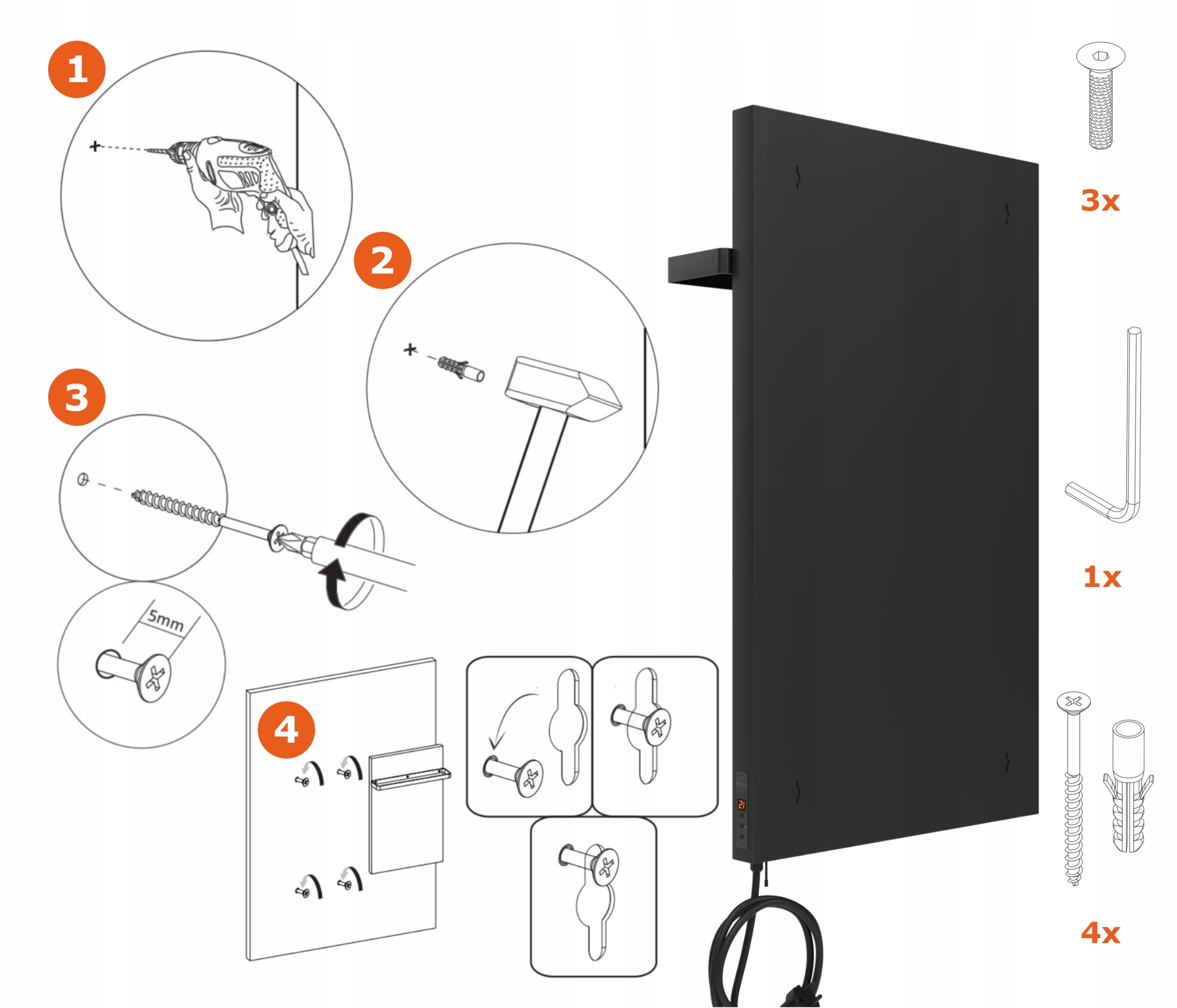 - В комплект входит: нагревательная панель, подвеска с креплениями, шурупы и дюбеля для настенного крепления (4 шт), инструкция пользователя. ul>