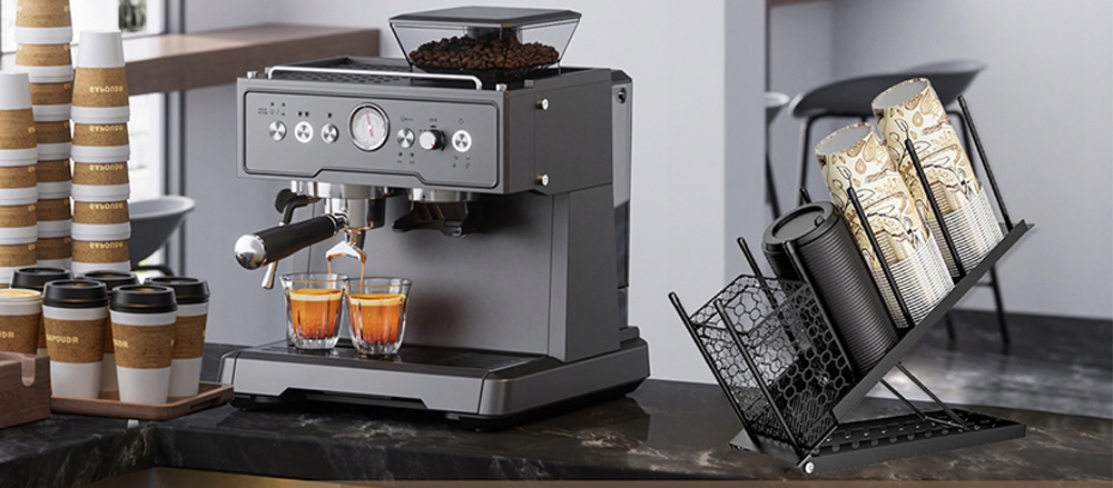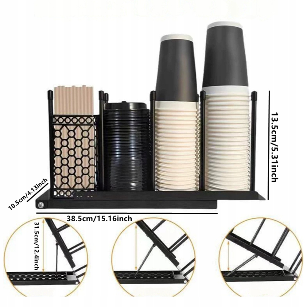 - Подстаканник доступен на различной высоте для облегчения доступа. Его можно положить ровно или отрегулировать по желаемой высоте. Это дает детям, сотрудникам и гостям легкий доступ к одноразовым стаканчикам для кофе, чашкам для напитков и крышкам.