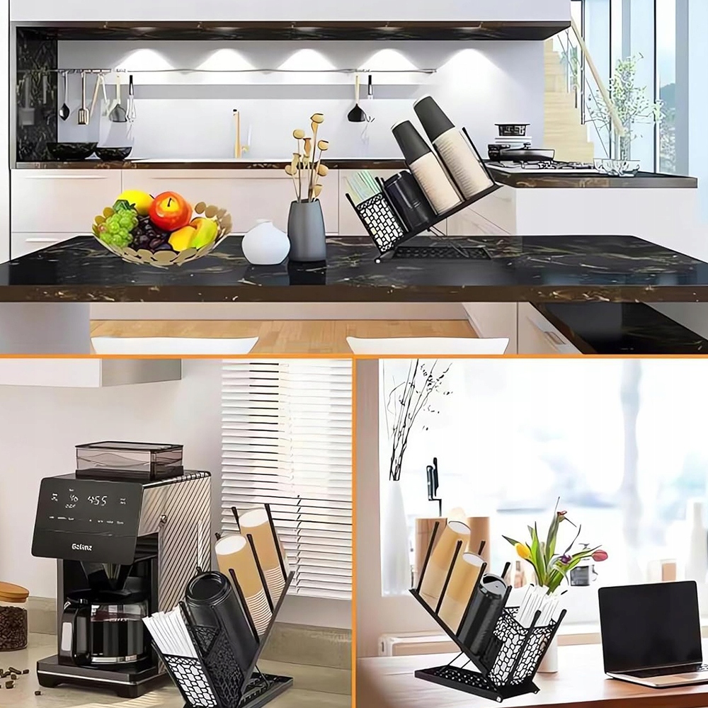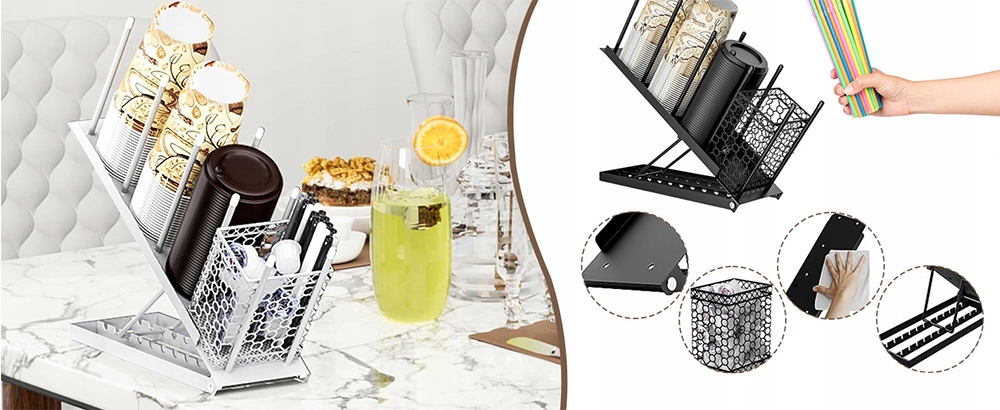 - Еще одним преимуществом является металлическая сетчатая корзина. Его можно использовать в качестве подставки для кофейника или подставки для соломинок, а также можно разобрать и использовать отдельно в качестве подставки для столовых приборов или другого небольшого органайзера, что делает его универсальным и подходящим для различных нужд хранения.