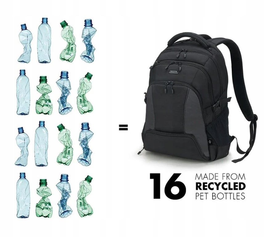 Сегодняшние действия формируют мир завтрашнего дня. Вот почему рюкзак DICOTA изготовлен из экологически чистых, переработанных ПЭТ-бутылок. Было переработано до 19 ПЭТ-бутылок, в результате чего появился экологически чистый продукт, который также имеет качество, внешний вид и отделку, которые вы знаете и любите. б> р>