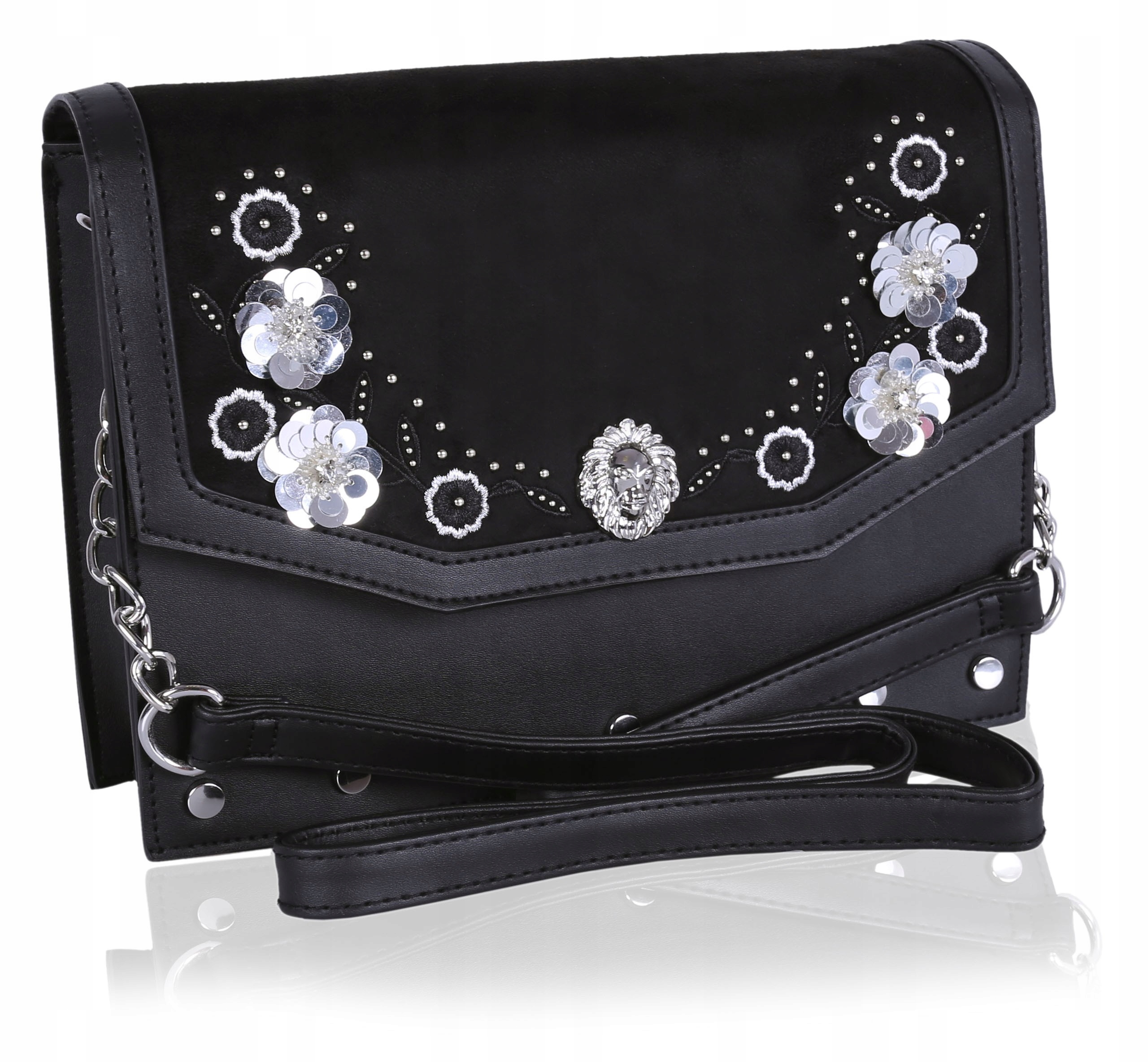Черный, прямоугольный пакет, с декоративной вышивкой и блестками