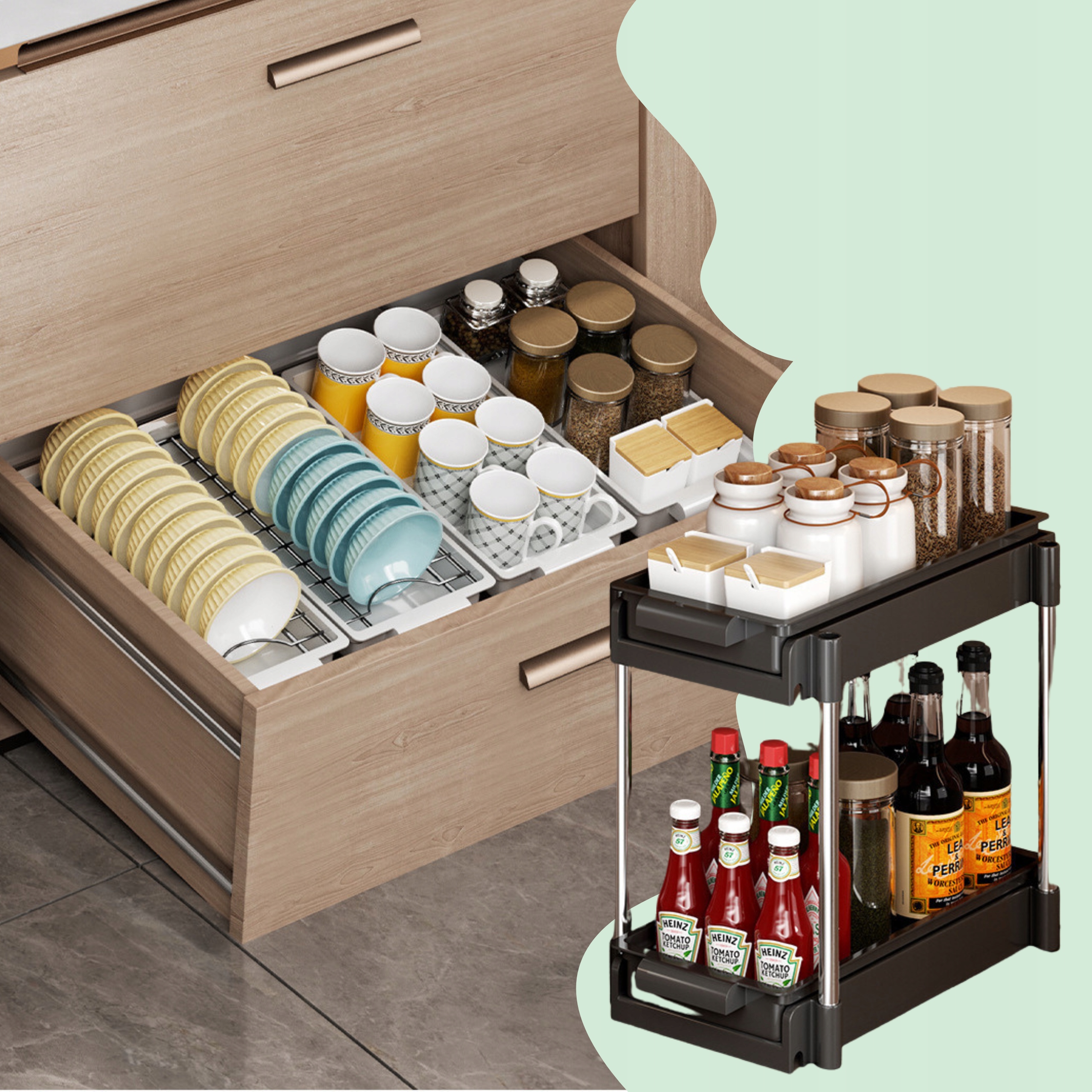 - Универсальное использование : идеально подходит для специй, бутылок, банок, кухонных аксессуаров или даже небольших продуктов питания.