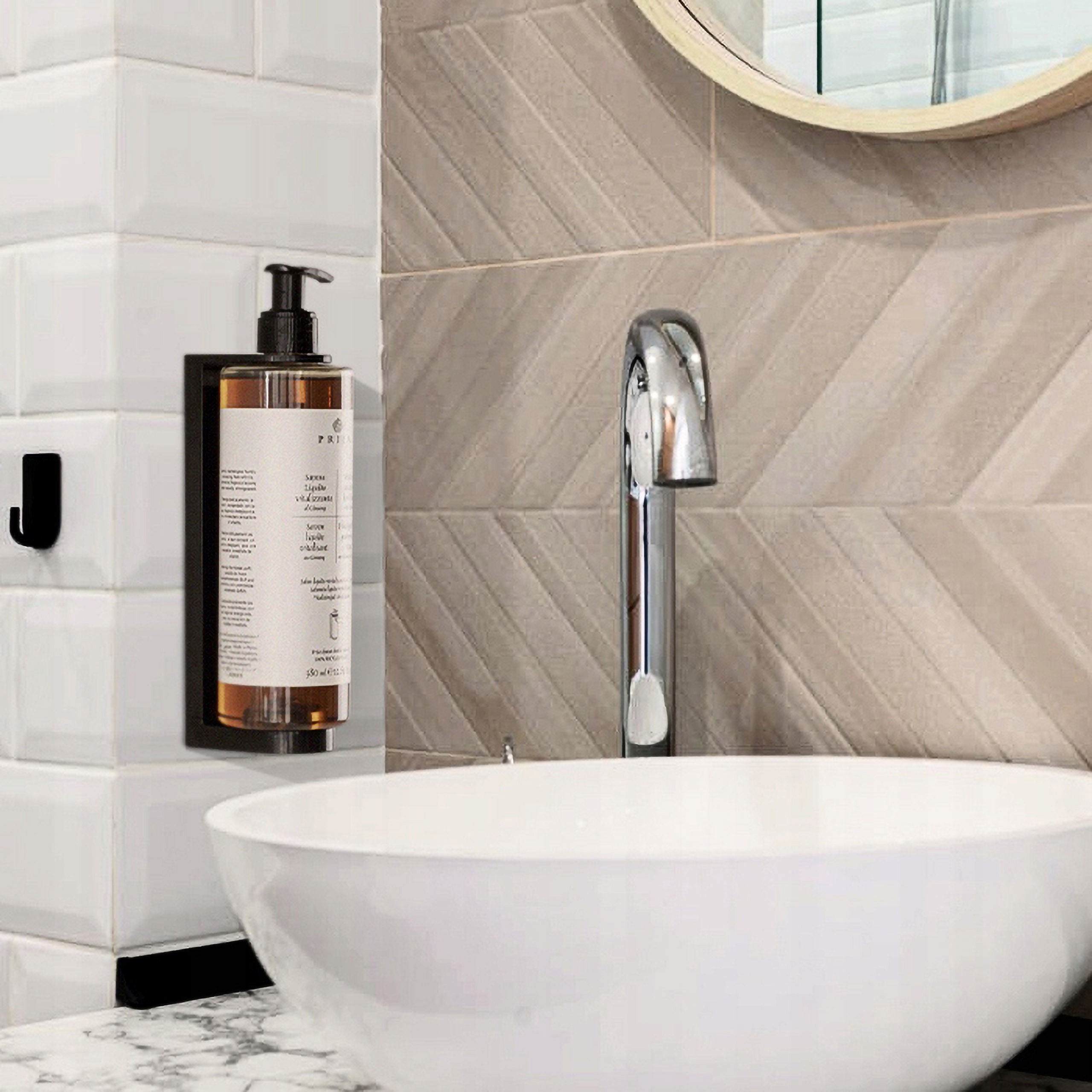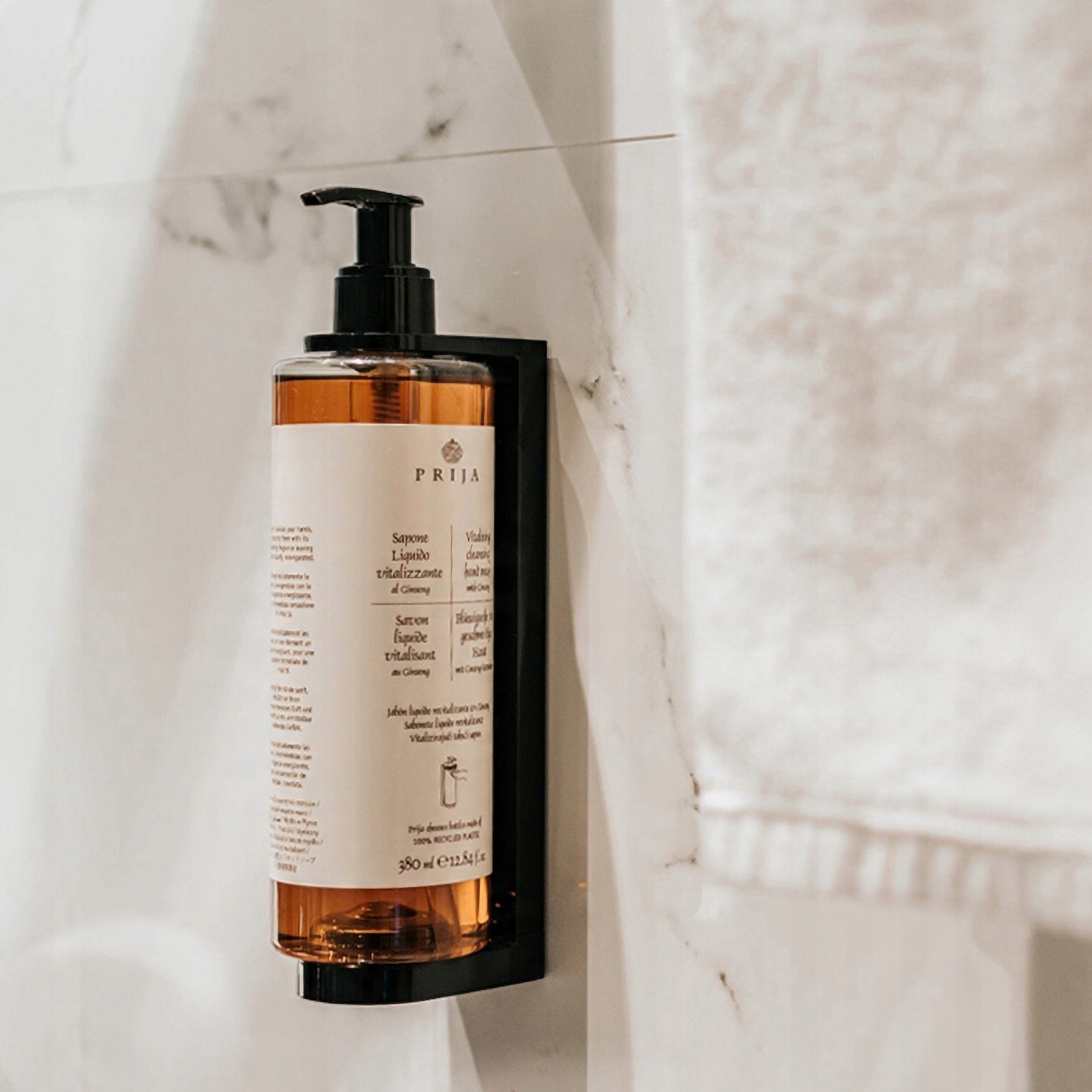 Черный настенный держатель для флакона с жидким мылом или гелем для душа из твердого пластика.