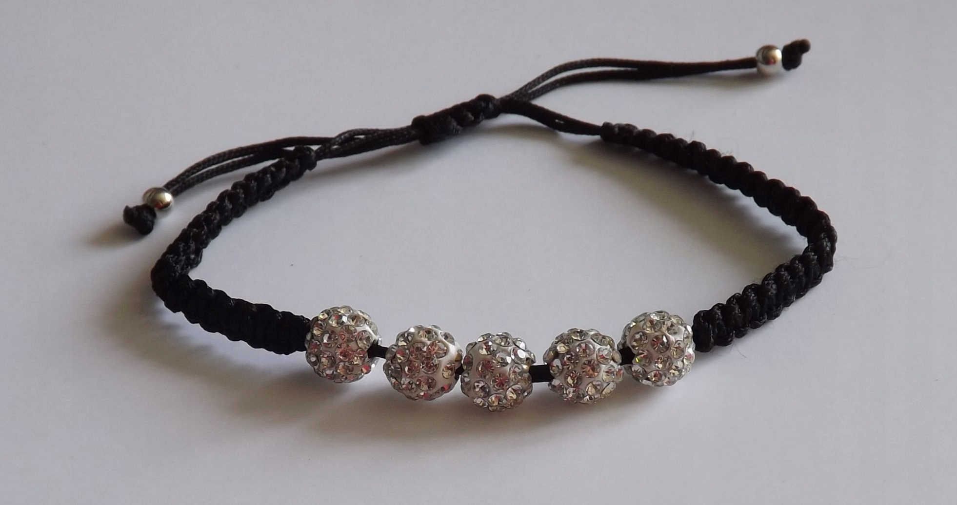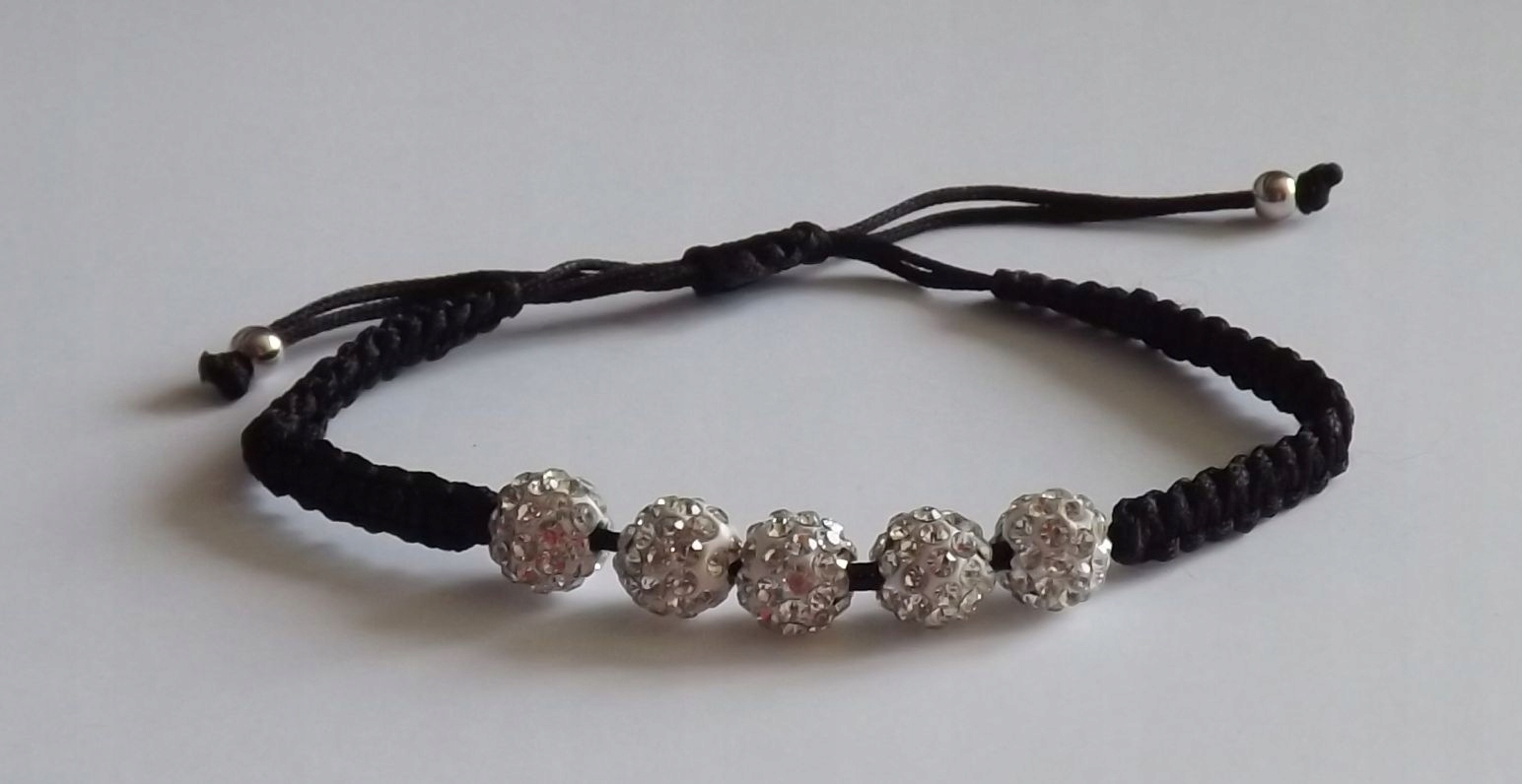 Браслет плетеный молодежный, из нежной, прочной, декоративной черной нити, украшение в виде шара, с цирконами.