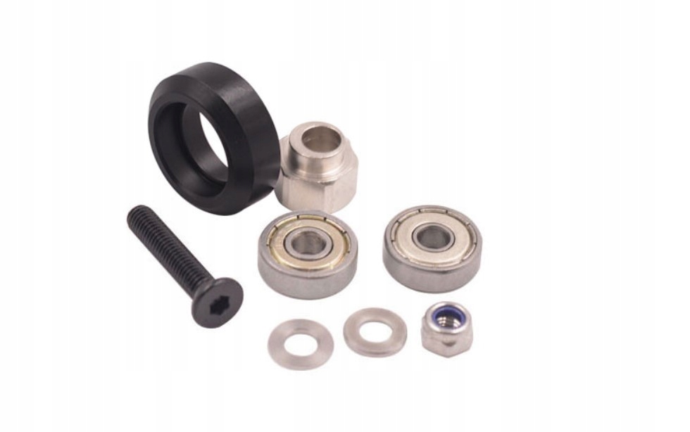 Прецизионная шайба расположена между двумя подшипниками. Для сборки сначала запрессуйте один подшипник в колесо. Затем, используя болт в качестве направляющей, наденьте прецизионную шайбу и второй подшипник на другую сторону колеса.