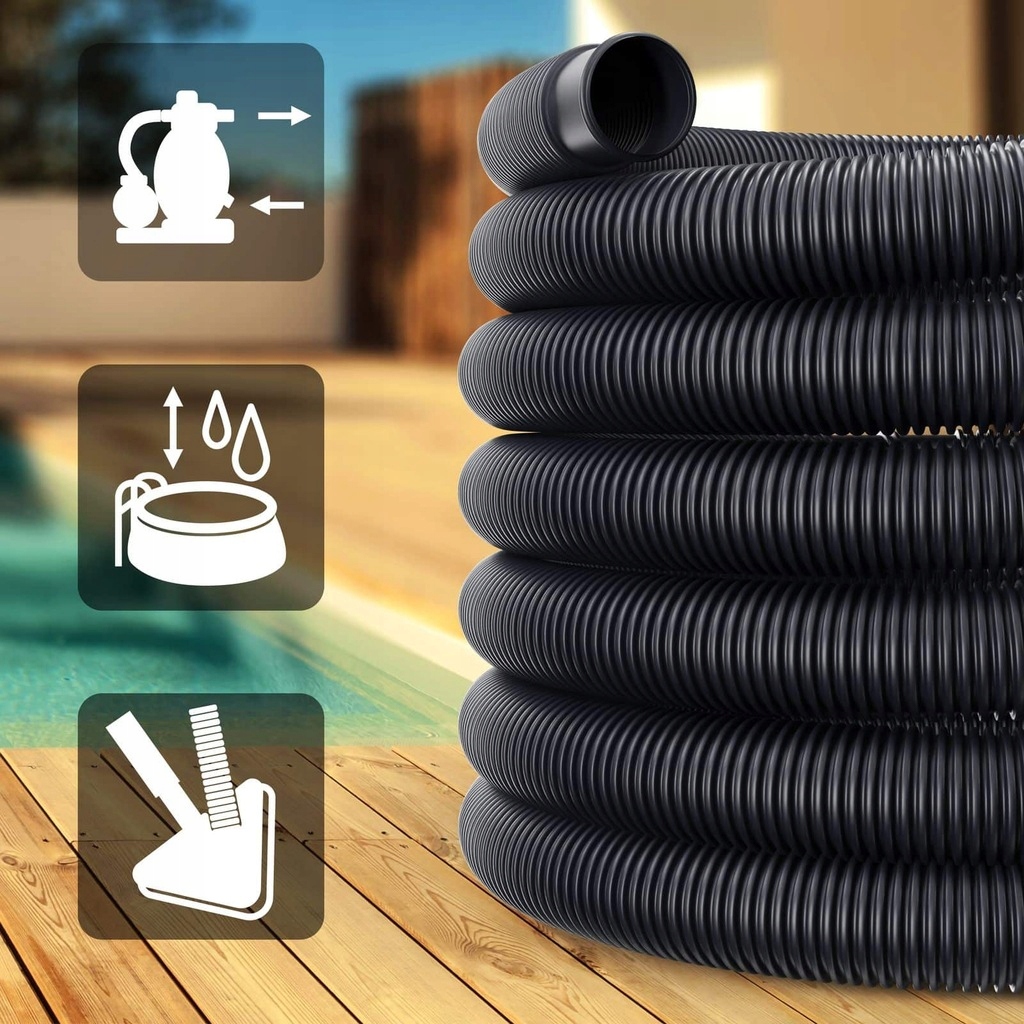 Шланг изготовлен из специального материала ПВХ, что делает его исключительно легким, гибким, устойчивым к механическим повреждениям и выдерживающим высокое давление воды. Его характерная гофрированная форма облегчает сгибание шланга и обеспечивает долговечность изделия. Он гибкий, прочный и устойчивый к погодным условиям и химикатам для бассейнов. С обеих сторон он заканчивается соединительными втулками для легкого и герметичного соединения. Он не трескается, не скручивается и не протекает. Его можно легко разделить на более короткие секции кратно 0,5 м. Подходит для всех бассейнов, а также для подключения фильтрующих насосов, песчаных фильтров, водонагревателей, пылесосов, скиммеров и других аксессуаров для бассейна с диаметром соединения 1,5 дюйма (38 мм).