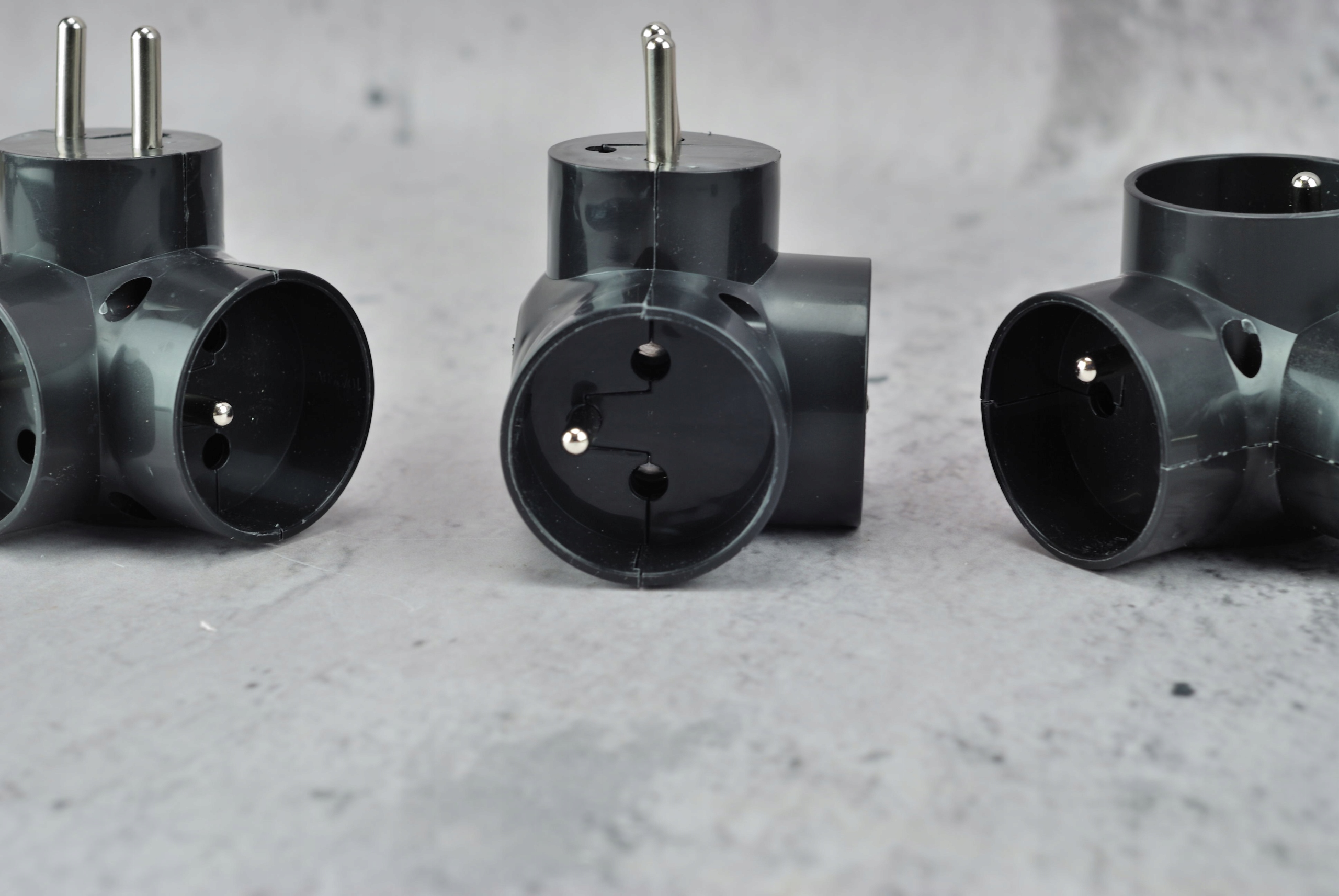 С помощью этого разветвителя вы сможете разделить одну розетку на три вилки. . Из розетки выходят две вилки сбоку и одна снизу.